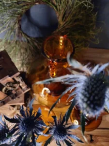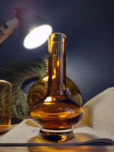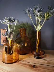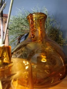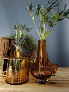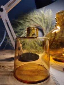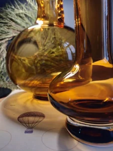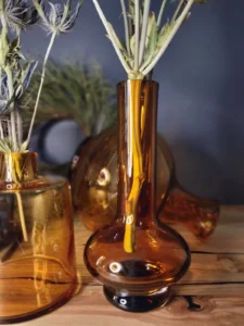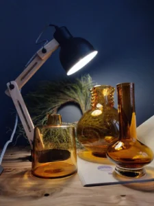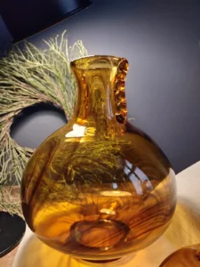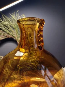 „Amber Beauties” – is a set of beautiful and very different in form vintage glasses. Each with an artistic look, handcrafted and with its own puzzling decades-long history. The main tone is set by an original in form, a cracked vase from the Laura Glassworks in Tarnow, 1970s, art glass, hand-molded, colored, translucent in amber. With characteristic decorations on the sides of the neck and unique ribbons. In this copy, the ribbons are much more delicate, with a subtle color of smoky glass. Included is a Georgus Waterford Crystal Marquis „Samba” Vintage Waterford (Ireland since 1783) vase with a slender neck of thick glass and a cracked base, hand-blown, the thick base is made of clear crystal glass, and the top bulb and stem are amber-gold honey-colored crystal glass. And the last vinatge vase, with its simple, austere geometric shape, calms down the collection a bit and proves that despite the different form of each glass, together they make a very impressive set😊.