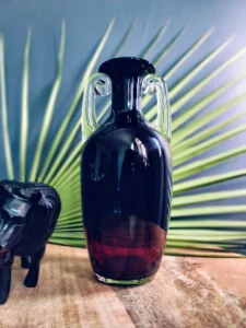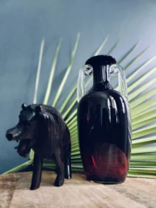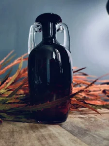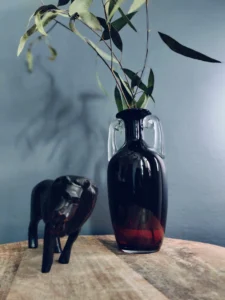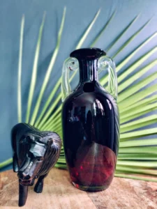 Wazon „Amfora” to ręcznie wykonane dzieło sztuki vintage, które swoją formą nawiązuje do antycznych naczyń i ich ponadczasowego piękna. Głęboka, burgundowa czerwień szkła z czarnym akcentem, zamknięta w eleganckiej, opływowej bryle z dwiema rzeźbiarskimi uchwytami z transparentnego szkła, tworzy kompozycję doskonałą — pełną kontrastów i wyrafinowania Wazon o klasycznej formie amfory, ręcznie wykonany, pochodzi z huty szkła Tarnowiec. Projekt – Jerzy Słuczan Orkusz, lata 70-te XX w.