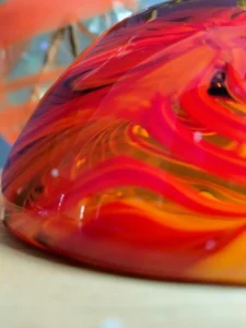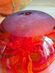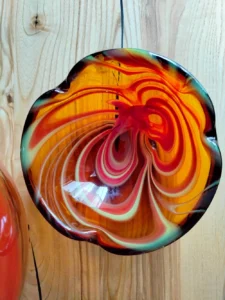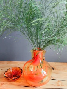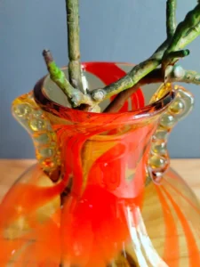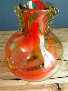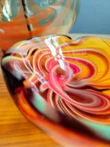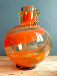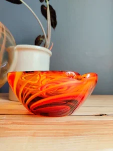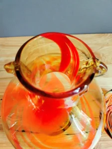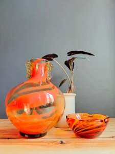Included: a bulging vase from Laura Glassworks 1970s, art glass, very impressive, honey-colored transparent, hand-tinted, orange staining. Ashtray – cobbler from Laura Glassworks 1970s XX, art glass, hand-molded in honey color with yellow, orange, maroon coloring. It can serve as a bowl or an original soap dish for handmade soap in bathroom decoration. Beautiful in its own right. A perfect gift set for lovers of vintage glassware. Glass condition very good.