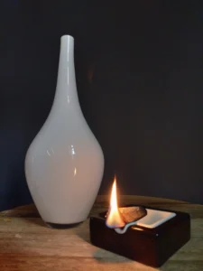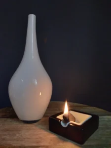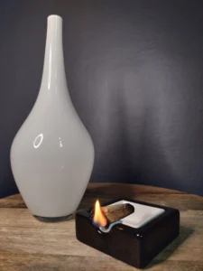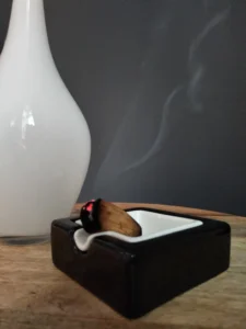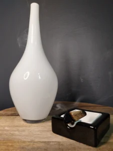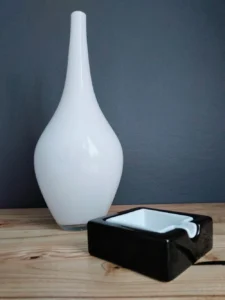 oraz designerska popielniczka lub naczynie pomocnicze – złożone z dwóch osobnych brył: czarnej podstawy i kontrastowego, białego wkładu.