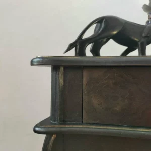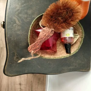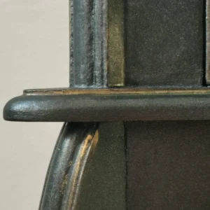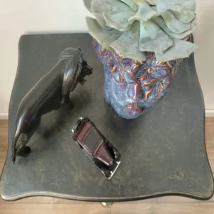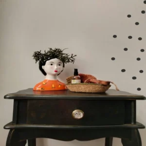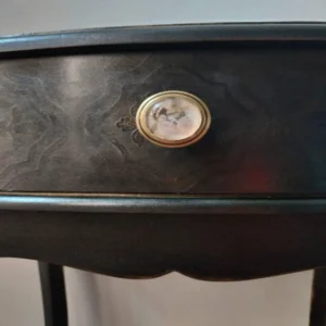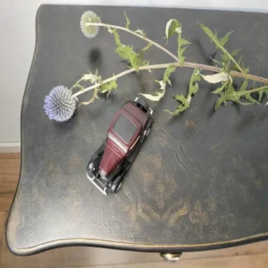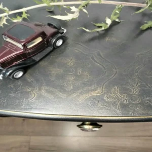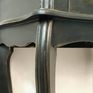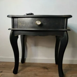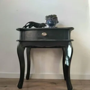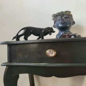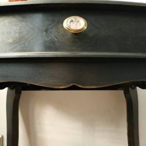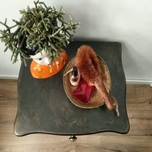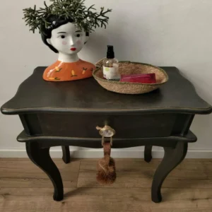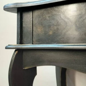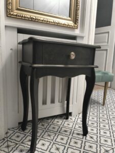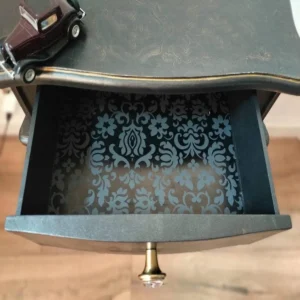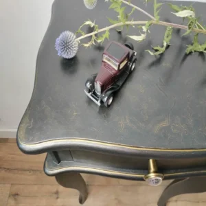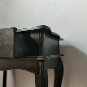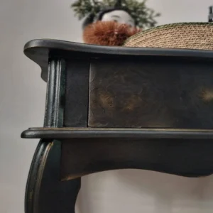 Black table / console „not obvious ” – the cabinet due to its format, lightness and very subtle type of styling, including delicate rubbing and aging, can serve as many functions as our imagination suggests. It can decorate a hallway, bedroom, living room or bathroom. Light and functional, not imposing style, but a beautiful and functional addition that gives the interior a unique vintage character. In the photos in a few so-called „pictures”. reveals. I couldn’t resist the bathroom styling, as you can see in most of the photos. Photos without filters and retouching, probably do not fully capture the subtle nature of the styling😊 The cabinet has undergone several metamorphoses because it comes from the so-called. second hand. So, from the classic white, to acrylic black, to this styling – where I used iridescent casein paint Color Black (Libéron) and gold paste. Top and drawer fronts covered with very delicate in form ornamentation, aged and protected with wax. Note: the cabinet protected by wax, under the influence of intensive use, the effect of rubbing/aging may strengthen.