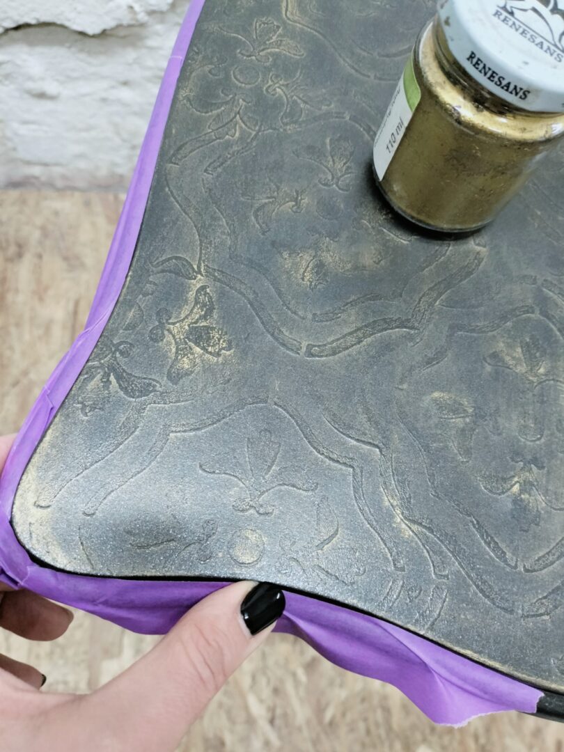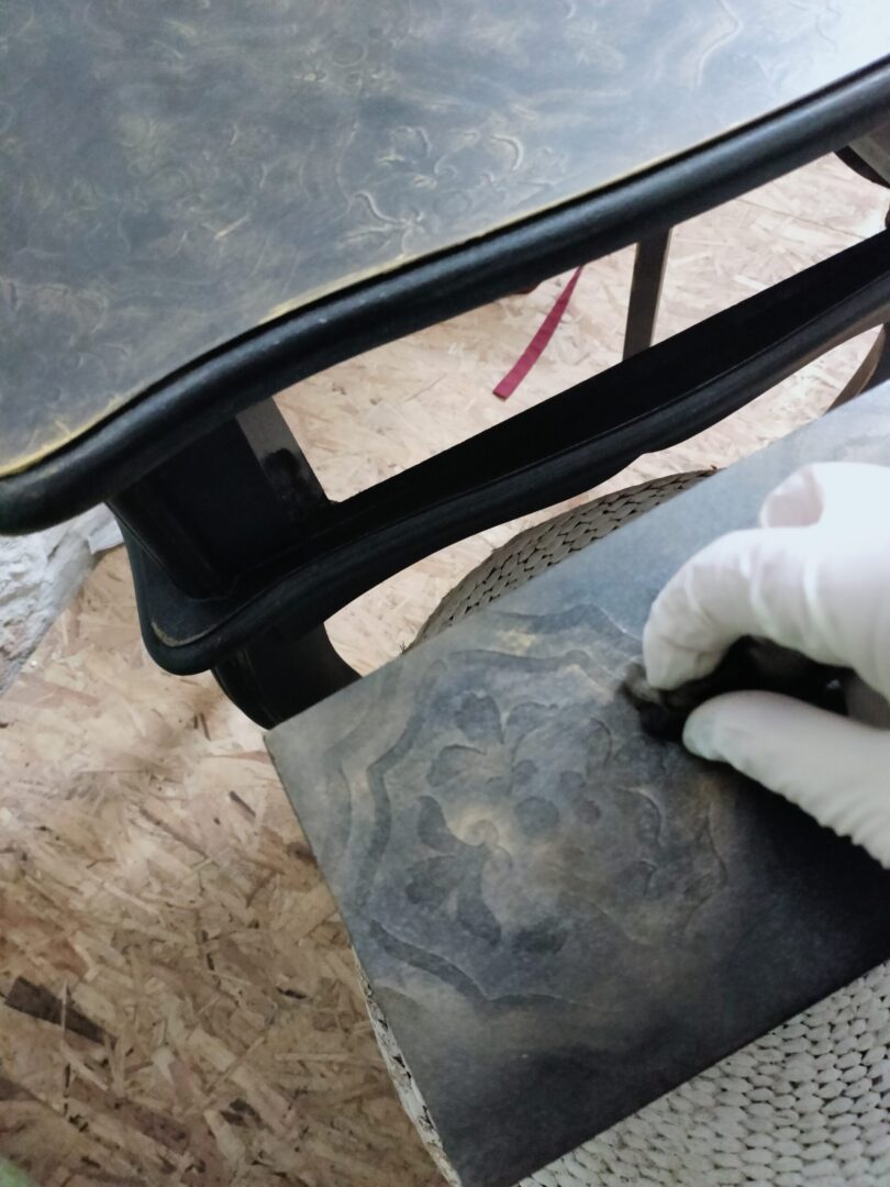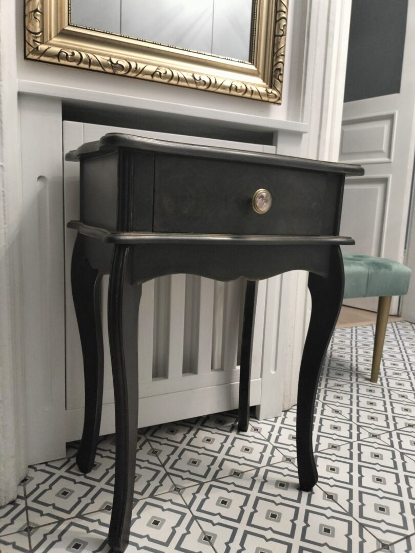 Do stylizacji użyłam opalizującej farby kazeinowej Barwy Czerni (Libéron) oraz złotej pasty. Blat i front szuflady pokryty bardzo delikatną w formie ornamentyką, postarzony i zabezpieczony woskiem. Uwaga: szafka zabezpieczona woskiem, pod wpływem intensywnego użytkowania efekt przetrać/ postarzenia może się wzmocnić.