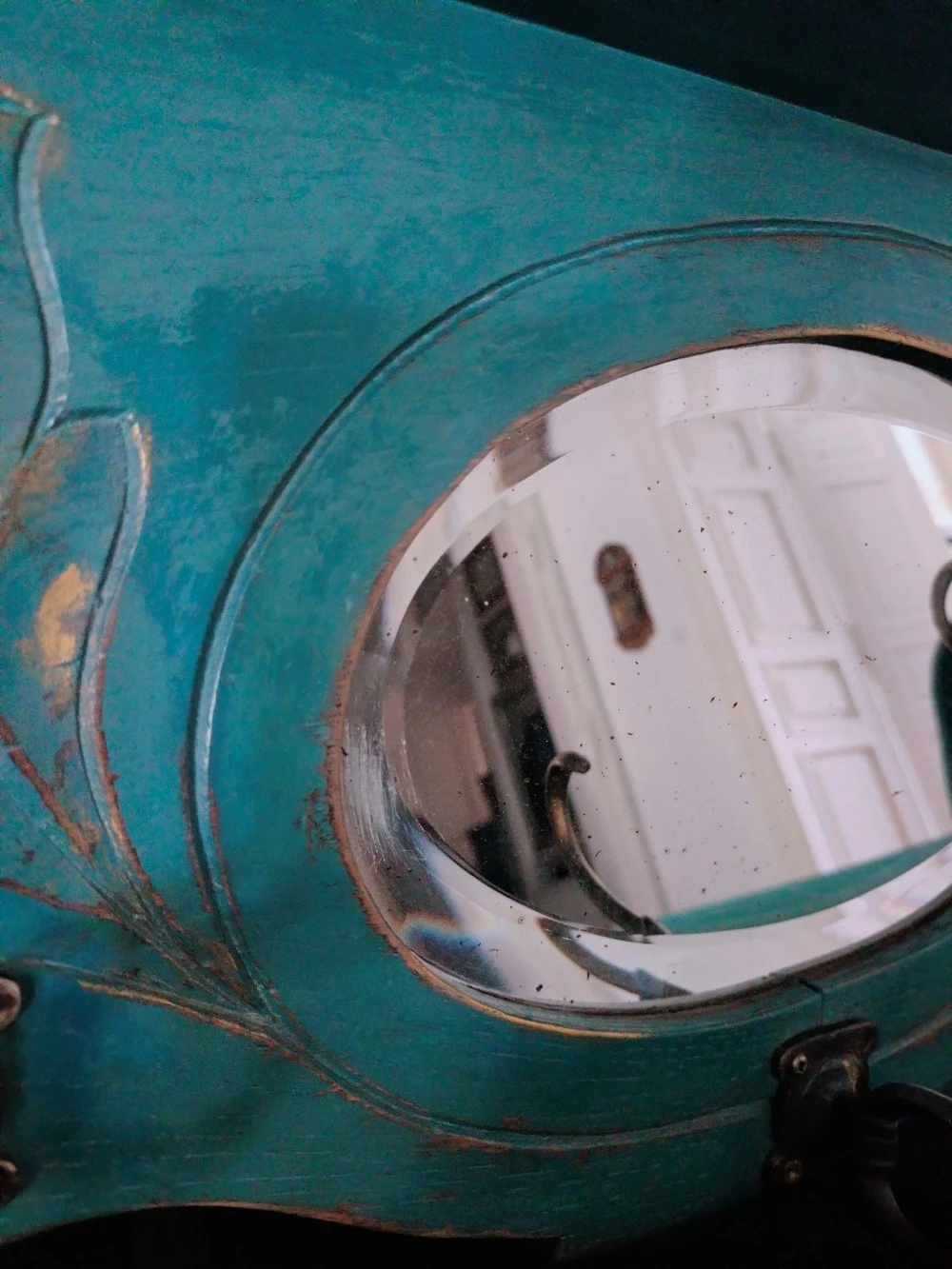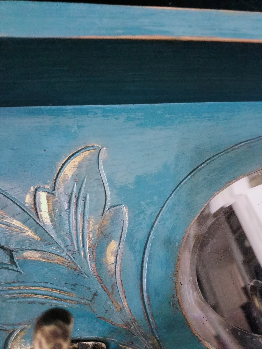 Stylizowany metodą Shabby chic, prześwitujące warstwy i kolory z palety błękitów plus złote przecierki na rzeźbionych elementach. Zachowane drobne, pęknięcia i ślady użytkowania drewna oraz fazowanego lustra, zabierają w podróż do przeszłości.