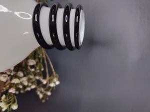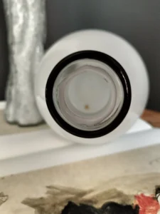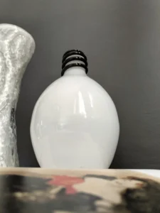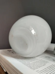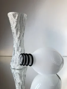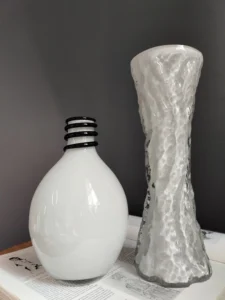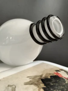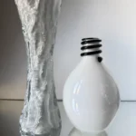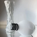 Opływowy kształt i perfekcyjny połysk w odcieniu mlecznej bieli, przełamany trzema czarnymi obręczami w górnej części. Obiekt, który wnosi nowoczesny twist do klasycznej formy. Ta piękna forma mlecznobiałego wazonu butli z czarną spiralą (opłotem) jest projektu Jarzego Słuczana Olkusza, z Huty Szkła Gospodarczego „Tarnowiec”.