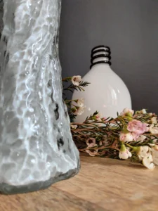 Zestaw „Kora we mgle” to spotkanie dwóch skrajnie różnych, a jednocześnie doskonale harmonizujących ze sobą form: monumentalnego wazonu o strukturalnej fakturze przypominającej porowaty pień drzewa zanurzony w mlecznej mgle oraz minimalistycznej, gładkiej butli z kontrastującymi czarnymi pierścieniami. Ich zderzenie to prawdziwa uczta dla oka – surowość i miękkość, faktura i połysk, natura i design.