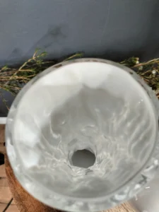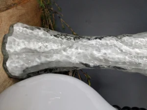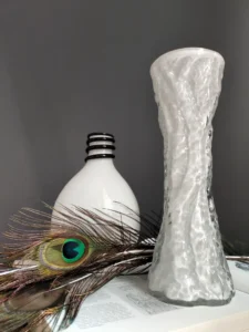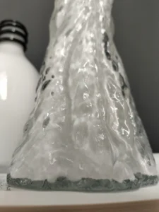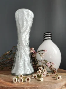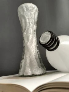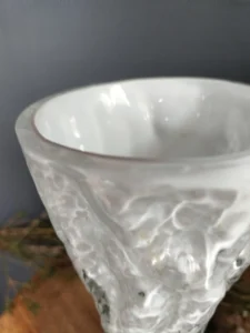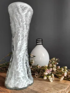 Wysoki, ciężki, wykonany ze szkła artystycznego o wyraźnej, strukturalnej powierzchni. Przypomina naturalną korę drzewa. Unikatowa gra światła i cienia sprawia, że zmienia swoje oblicze w zależności od pory dnia i ustawienia. Wysoki wazon projektu Kurta Wokana, z niemieckiej Huty Ingrid z dwuwarstwowego szkła przypominającego korę drzewa, pierwsza warstwa przeźroczysta, druga biała. Wazony powstałe w latach 70 -tych i 80-tych XX w.