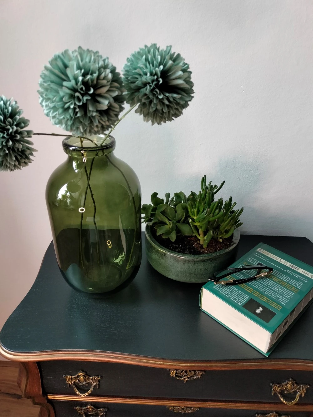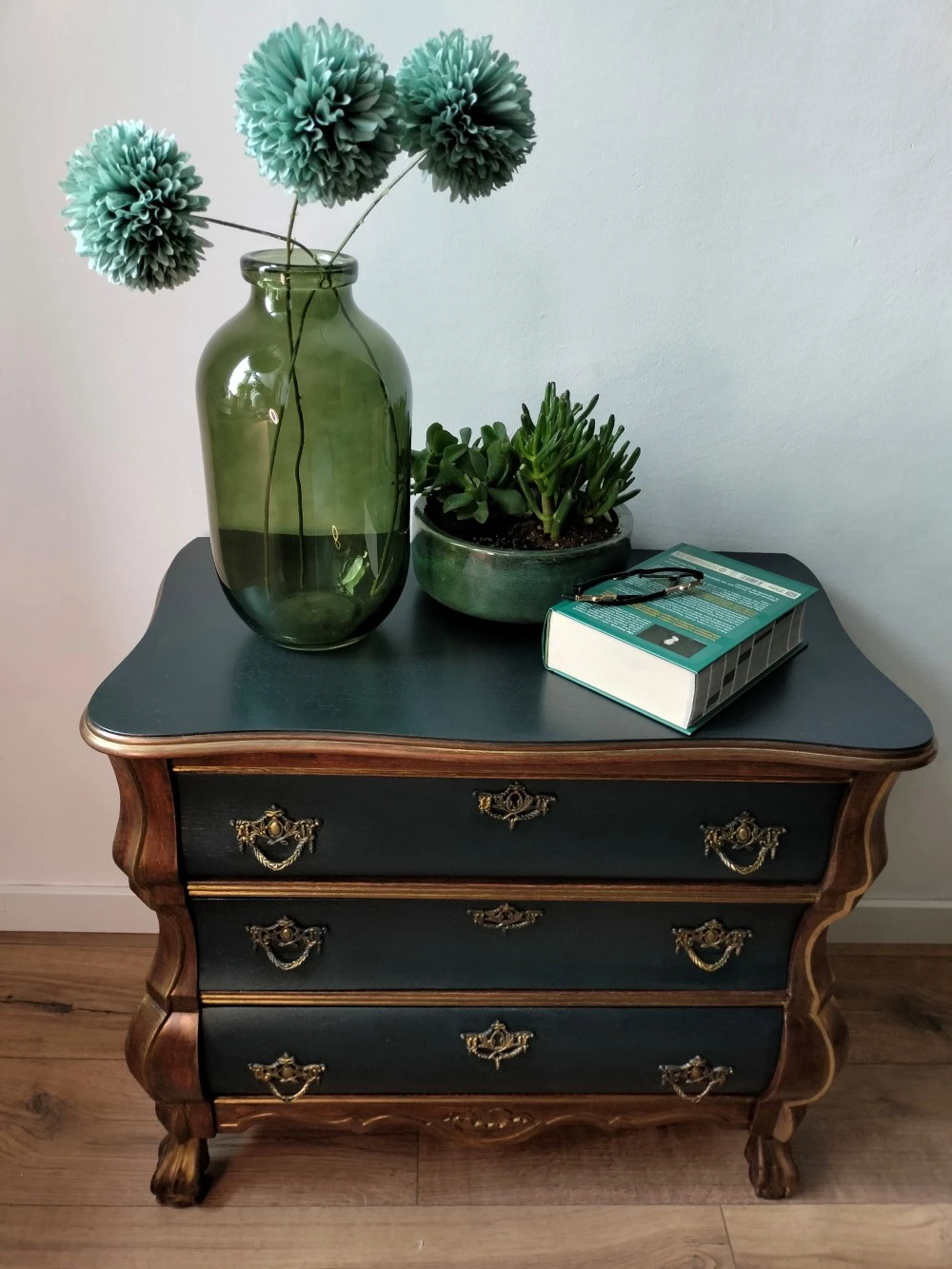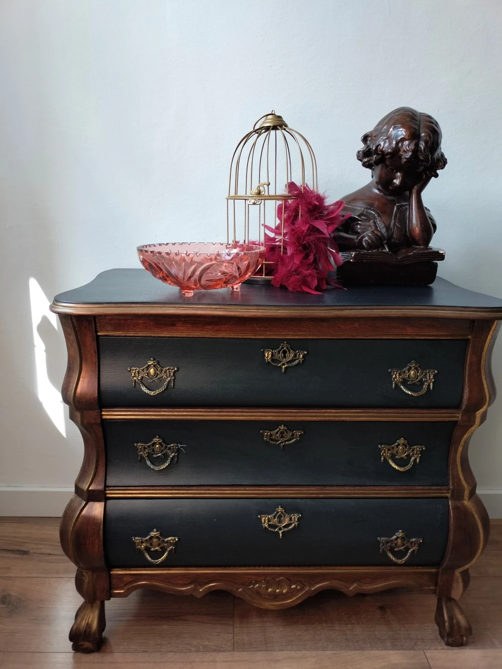 Szukasz mebla, który przyciąga spojrzenia, podkreśla charakter wnętrza i opowiada historię? Komoda „Duża czarna” to mistrzowsko odrestaurowany mebel vintage, który zachwyca unikalnym połączeniem matowej czerni, naturalnego drewna i szlachetnego złota. Zjawiskowe okucia i falista linia frontów podkreślają jej klasyczne dziedzictwo, a odważna kolorystyka wnosi nowoczesną nutę.