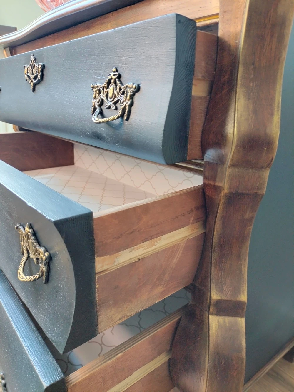 Wnętrze z duszą – szuflady wyłożone dekoracyjnym papierem w odcieniu kości słoniowej ze złotym wzorem.