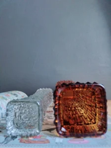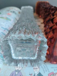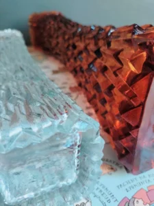 Zestaw „Dwie wieże” składa się z dwóch szklanych wazonów wykonanych w technice tłoczonego szkła – jeden w kolorze głębokiej, bursztynowej czerwieni z przejściem w czerń, drugi transparentny, krystalicznie czysty. Ich wyjątkowa faktura przywodzi na myśl modernistyczne budownictwo, a geometryczne wytłoczenia potęgują wrażenie monumentalności.
