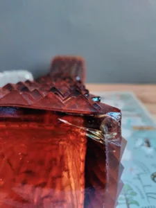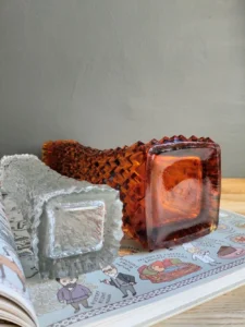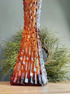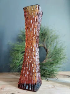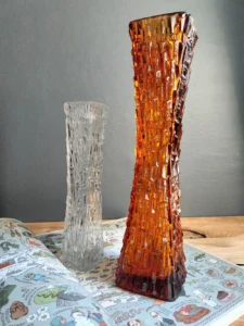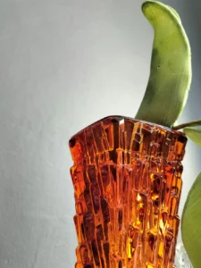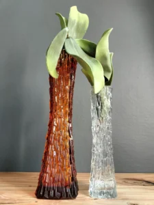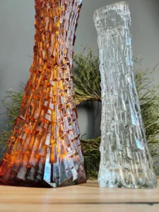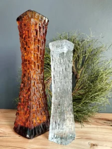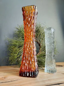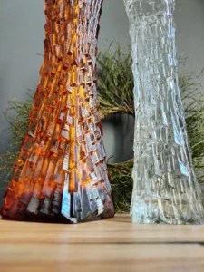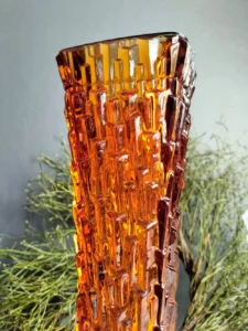 Dwa unikatowe w formie, smukłe wazony wykonane ze szkła prasowanego barwionego w masie, kolor bursztyn + przeźroczysty. Powierzchnia w geometryczne wzory, wyżłobienia, porowata. Podstawa w kwadracie. Piękna forma wazonów plus kolorystyka, spławią że duet ozdobi każde wnętrze. Austria Oberglas lata 60 / 70 -te ubiegłego wieku.