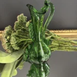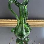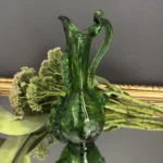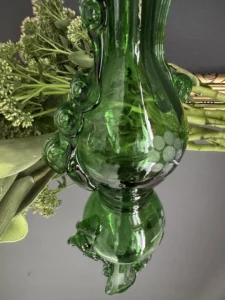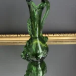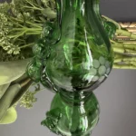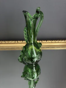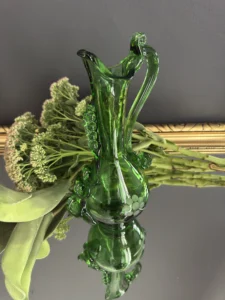 Dzbanek wykonany został z ręcznie formowanego szkła o głębokiej zieleni. Posiada spiralny, dekoracyjny uchwyt, tłoczone bąbelki oraz grawerowany motyw kiści winogron. Z jednej strony subtelnie falowany wylew, z drugiej – pełen ekspresji kształt nawiązujący do sztuki secesyjnej.