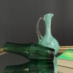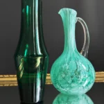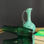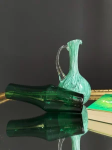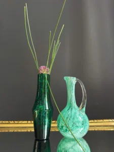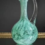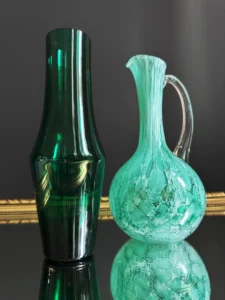 Drugi element, to dzban ze szkła sodowego, w kolorze chłodnej mięty, z charakterystycznymi dla szkła Murano morami, szkło barwione w masie, powstałe w latach 60-70 XX w. Ręcznie formowany uchwyt dodaje mu elegancji i użytkowego charakteru. Oba obiekty doskonale się uzupełniają – kontrastując fakturą, ale spójną kolorystyką.
