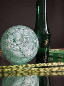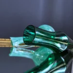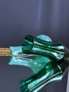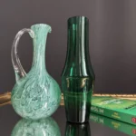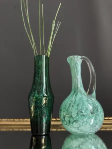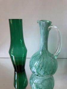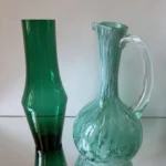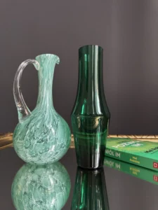 Zestaw dwóch wyjątkowych obiektów ze szkła artystycznego, to spotkanie klasycznego rzemiosła z modernistyczną formą. Pierwszy element to ciemnozielony wazon o geometrycznej, modernistycznej, lekko zwężanej sylwetce, wykonany ze szkła dymionego – wazon z fińskiego szkła artystycznego Riihimaki, datowany na lata 60-te Projekt Tamara Aladin.