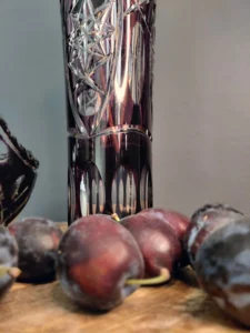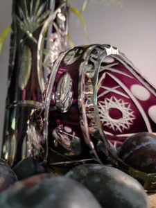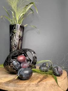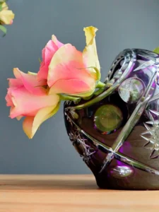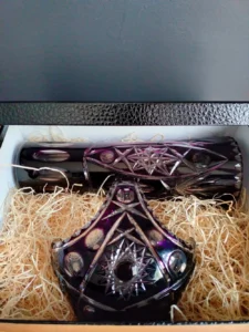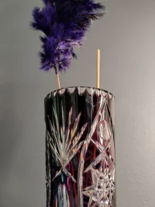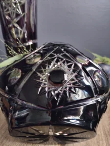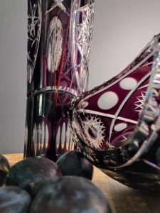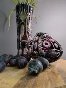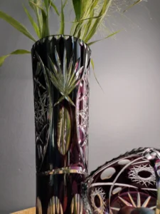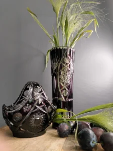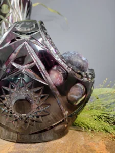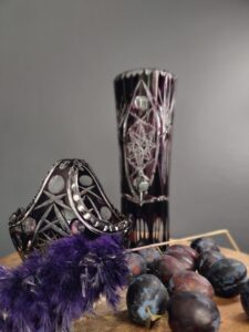 A vintage set for crystal lovers in a striking eggplant color. A candy basket made in Poland in the 1960s-70s te- 20th century, mouth-blown crystal, hand-cut and hand-polished, and a vase of similar origin. The composition is united by color and material. The vase, with its universal simple shape, and the basket, associated only with communist times, form a well-matched duo. The crystals are without blemishes, in very good condition.