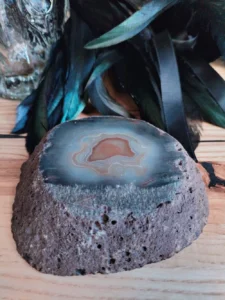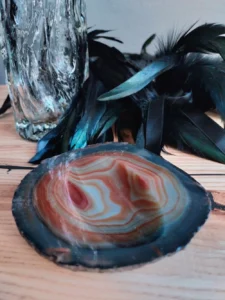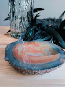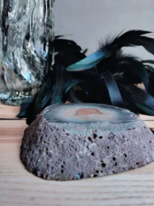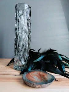 Unprecedented set: a unique, artistic vase so-called. „trunk” – 1970s. In the 1970s. Hortensia glassworks, is made with pressed glass technique, smoky glass, top edge ground and vintage ashtray made of semi-precious agate mineral of brown color. The stone polished and honed only partially in the top layer, where an indentation was made. The stone is left in its natural form, which adds a unique character to the item. The item can serve many utilitarian functions (e.g., a soap dish, jewelry dish, incense holder, etc.) , and before all, it is a decorative cachet.