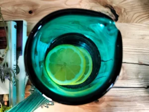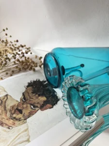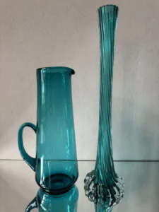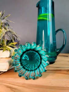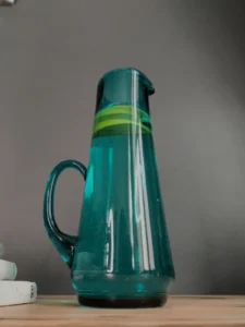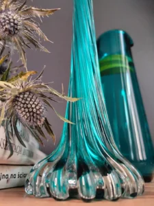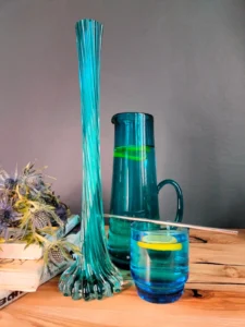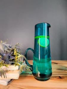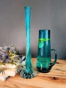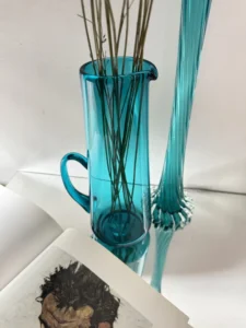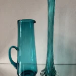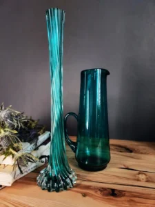 Zanurz się w głębię koloru. Ten unikatowy zestaw szkła artystycznego to spotkanie nowoczesnego wzornictwa z klasyczną elegancją vintage. Szklany wazon o fantazyjnie formowanej stopie i wysmukłym kształcie oraz wysoki dzbanek z uchem w odcieniu głębokiego lazuru tworzą duet idealny — pełen światła, harmonii i delikatnych załamań koloru.