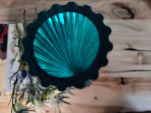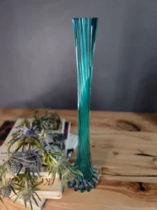 W duecie efektowny wazon flet z lat 70- tych XX w. ze szkła dwuwarstwowego, piękny odcień turkusu plus skręt szkła, rozpraszają światło w niesamowity sposób.