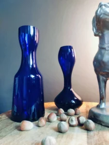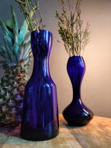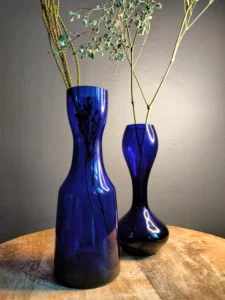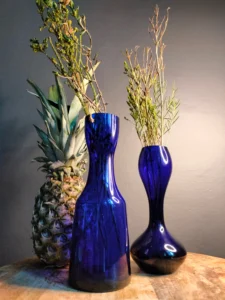 Zestaw „Kobalt o zmroku” to ukłon w stronę miłośników ponadczasowej elegancji i wyrazistych detali. Dwa wazy o kształtach rzeźbiarskich i kolorze granatu z kobaltową poświatą przywodzą na myśl intensywność zmierzchu. Wykonany z ręcznie formowanego szkła sodowego, barwionego w masie. Niesamowicie odbija szkło, oryginalna i unikatowa forma wazonów doda charakteru i unikatowości każdemu wnętrzu. Prawdopodobnie wazony z lat 60-tych wykonane przez Wiking Crystal, ze Szwecji.