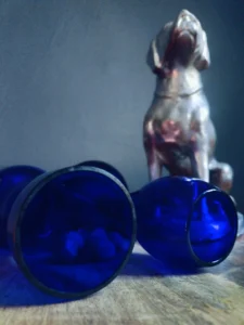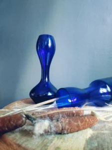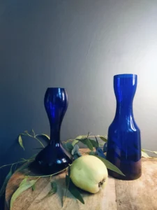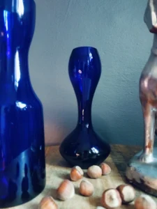 Szlachetne szkło vintage w odcieniu ciemnego kobaltu, z piękną głębią koloru widoczną pod światło – każdy egzemplarz zachwyca innym refleksem.
