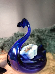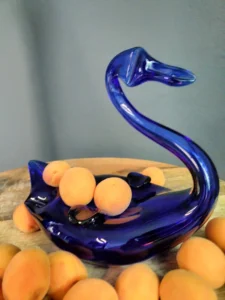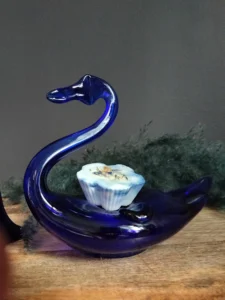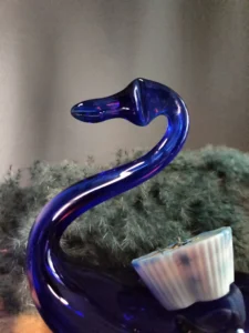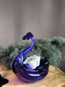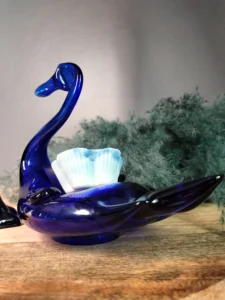 Dekoracyjny łabędź vintage – ręcznie formowany z głębokiego kobaltowego szkła, doskonale oddający grę światła w masywnych taflach szkła. Pełni funkcję zarówno rzeźby, jak i użytkowego naczynia np. na drobiazgi.