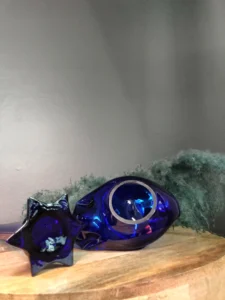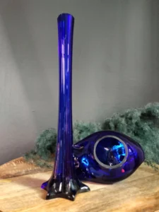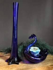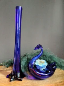 W zestawie: kobaltowy ręcznie formowany, klasyczny w formie wazon typu” flet” z czeskiej huty szkła Crystal BOHEMIA w zestawie z kobaltowym ręcznie formowanym łabędziem – popielnicą z lat 70 – tych ubiegłego wieku.