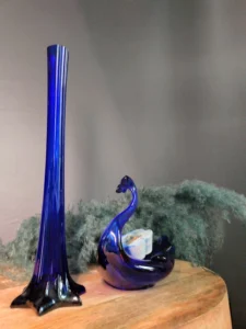 Jeśli szukasz dekoracji, która łączy kunszt, elegancję i niepowtarzalny klimat lat 60./70., ten zestaw jest dla Ciebie. Wysoki, kobaltowy wazon o subtelnym skręcie i szklany łabędź z głębią koloru to duet, który nada wnętrzu artystyczny i wyrafinowany charakter.