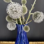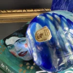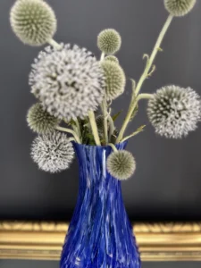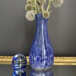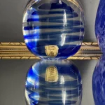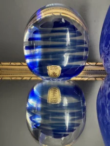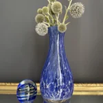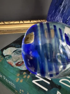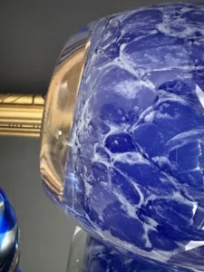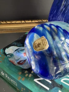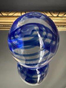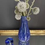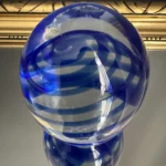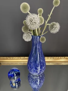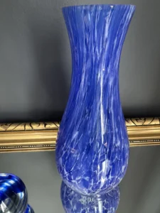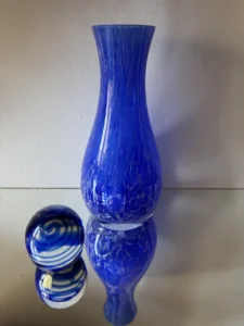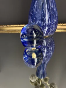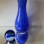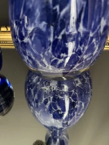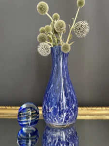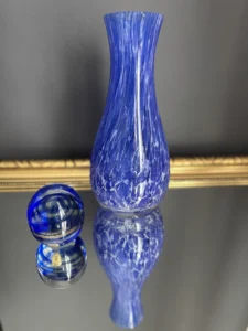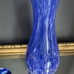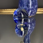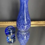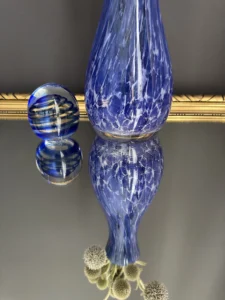 Zestaw „Kobaltowa Fala” to połączenie elegancji, dynamiki i szklanej perfekcji. Smukły, wysoki wazon artystyczny o płynnej linii i mieniącej się powierzchni łączy w sobie intensywny błękit z wirującą bielą – tworząc efekt falujących smug w szkle. To szkło żyje światłem – odbija, załamuje, eksponuje każdy detal. Towarzyszy mu kula dekoracyjna z kobaltowymi spiralami zatopionymi w szkle kryształowym – idealna jako paperweight, dekoracja regału lub szklana rzeźba. Wazon, pochodzenie prawdopodobnie Murano, natomiast kula z oryginalną nalepką pochodzi z Niemiec.