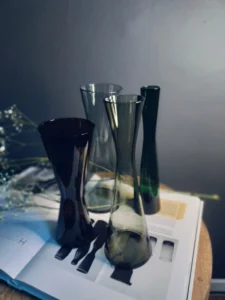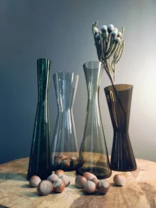 Wazony dymione, pochodzą z lat 60-tych XX w. z serii turmalinów Wagenfeld. Zaprojektowane przez prof. Wilhelma Wagenfelda i wyprodukowane przez WMF w Niemczech. Wykonane z wysokiej jakości szkła w odcieniach niebieskiego, szarego, brązu i zieleni.