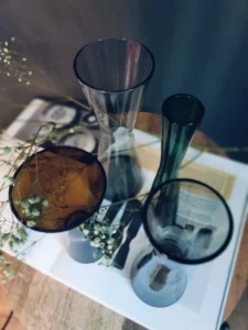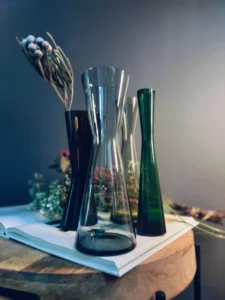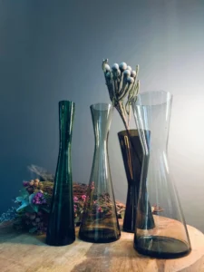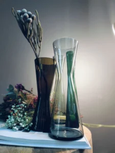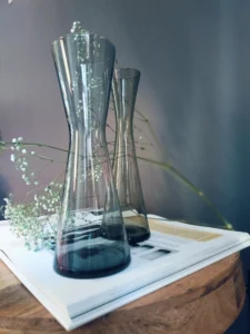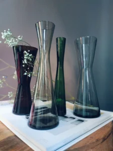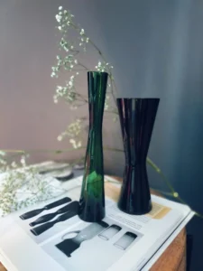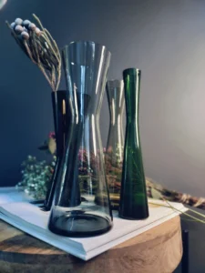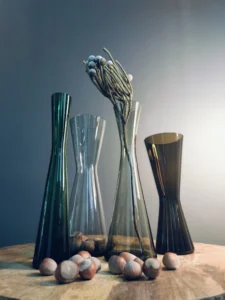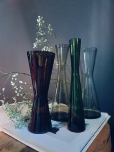 Każdy z wazonów został wykonany ręcznie z barwionego szkła prasowanego lub dmuchanego — to przedmioty o unikalnym charakterze, które zachwycają nie tylko proporcją, ale i światłem odbijającym się w ich gładkiej powierzchni.