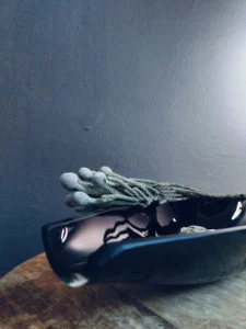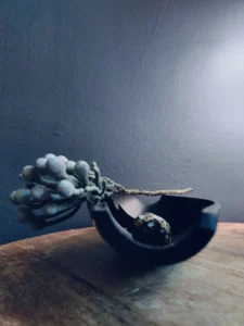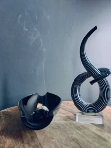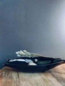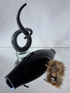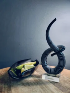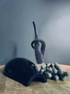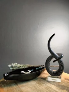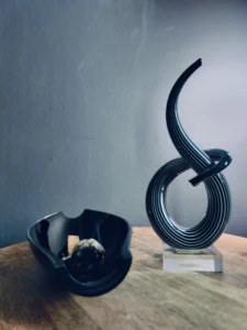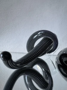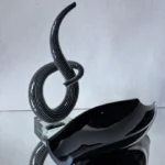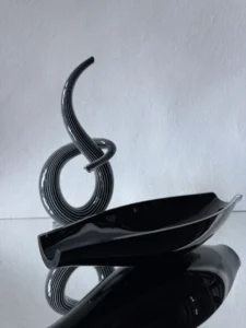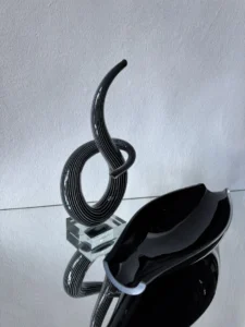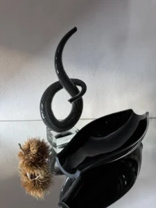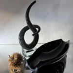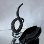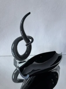 Zestaw „Węzeł miłosny” to duet artystycznego szkła vintage, który łączy rzeźbiarską ekspresję z eleganckim minimalizmem. Obiekty o unikalnej formie i głębokiej, połyskującej czerni stanowią manifest stylu – idealny do nowoczesnych, loftowych i eklektycznych wnętrz. To więcej niż dekoracja – to sztuka użytkowa, która mówi własnym językiem.