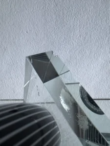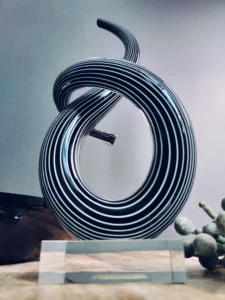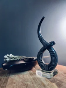 Szklana rzeźba o dynamicznym splocie, przypominającym symbol nieskończoności – wykonana ze szkła prążkowanego, osadzona na przejrzystej podstawie. Niezwykła gra linii tworzy przestrzenną iluzję ruchu i emocji.
