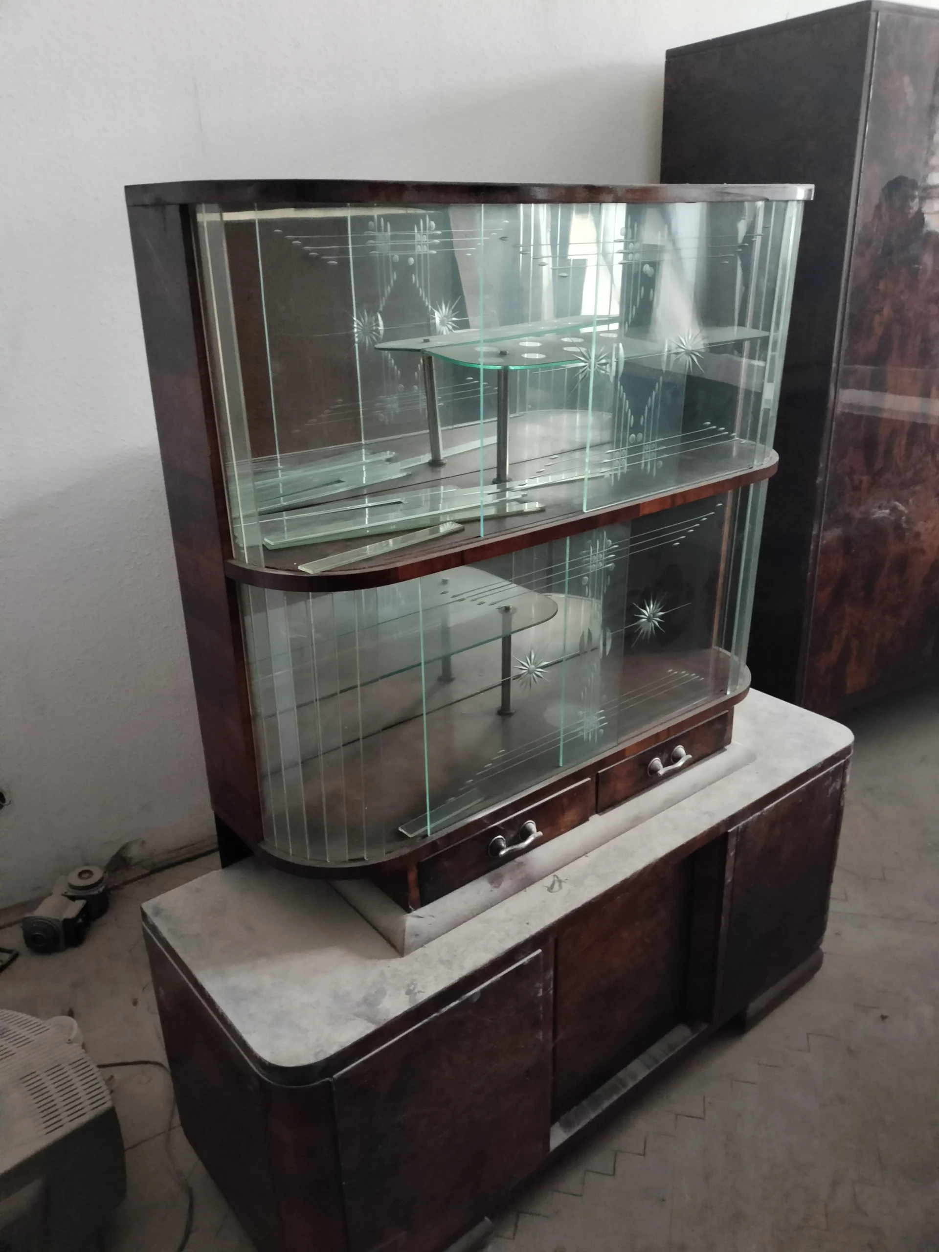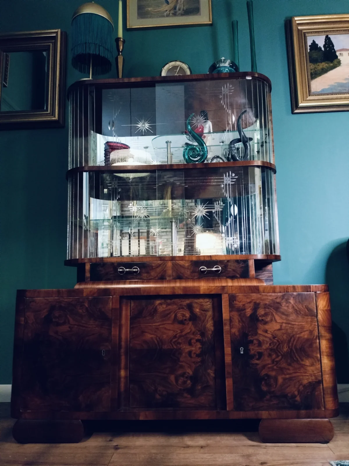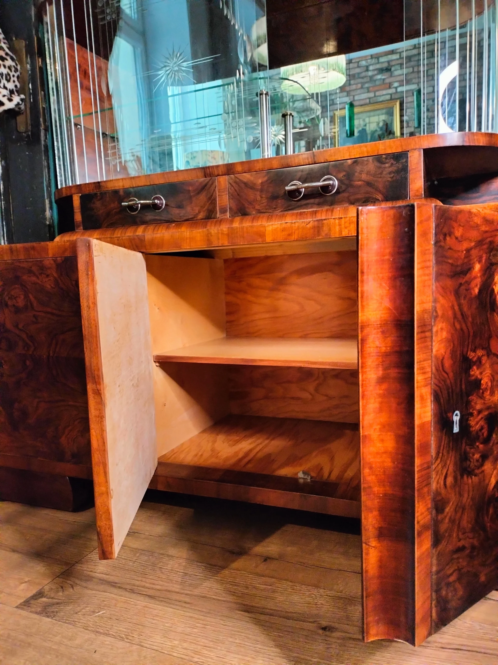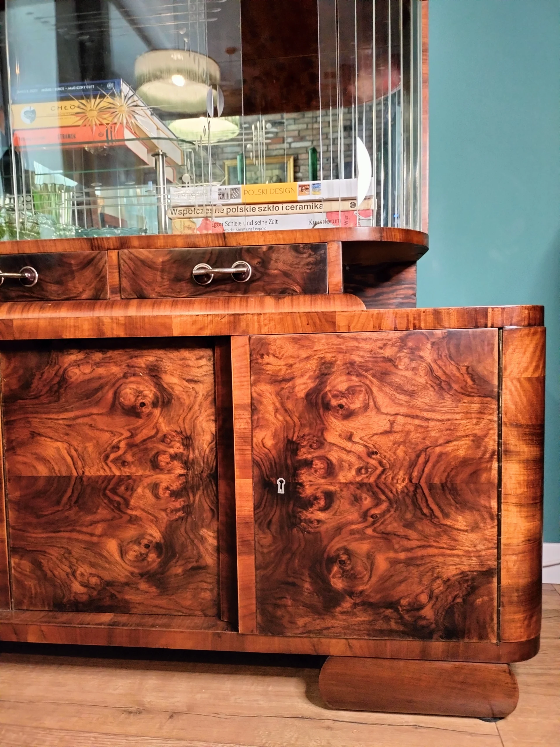 Połączenie przeszklonej górnej części z lustrem, nadaje bryle mebla lekkości. Lustra i szkło powiększą optycznie przestrzeń w której się znajdzie. Emanuje klasą, jest unikatowy, a w jego towarzystwie poczują się komfortowo zarówno ci którzy preferują minimalizm, jak ci którzy uwielbiają bogactwo dekoracyjnych dodatków. Doda blasku (dosłownie:) pomieszczeniom w Twoim domu, jaki i w firmie. To, gdzie zostanie umieszczony i jak wykorzystany, ogranicza jedynie wyobraźnia jego właściciela.Fornir w oryginalnym kolorze wpadającego w czerwień orzecha. Posiada dwie przeszklone półki, z półokrągłym zestawem paneli szklanych po 9 sztuk z każdej strony (każdy osobno umieszczony), oryginalne ozdobne szyby ze szlifowanego szkła na 2 poziomach, 2 małe szuflady oraz 2 pojemne szafki dolne (pojedyncza i podwójna). Uchwyty szuflad oryginalne.Witryna z łatwością dopasuje się do przestrzeni nowoczesnych, eklektycznych i vintage. Świetnie wyeksponuje ceramikę artystyczną, szkło dekoracyjne lub ulubione książki. Może pełnić funkcję barku, biblioteczki albo szlachetnego akcentu we wnętrzu – zachowując równowagę między estetyką a funkcją.