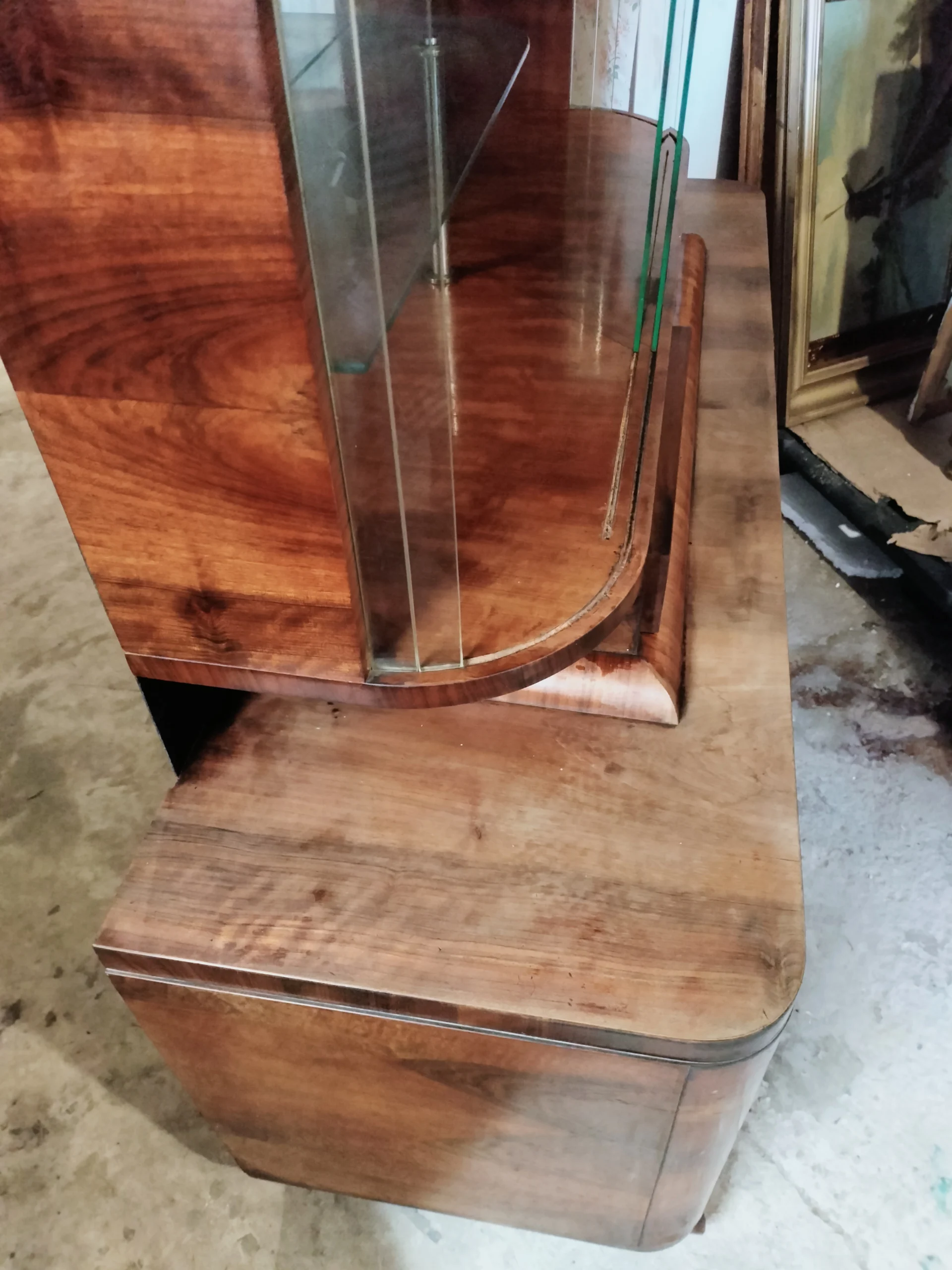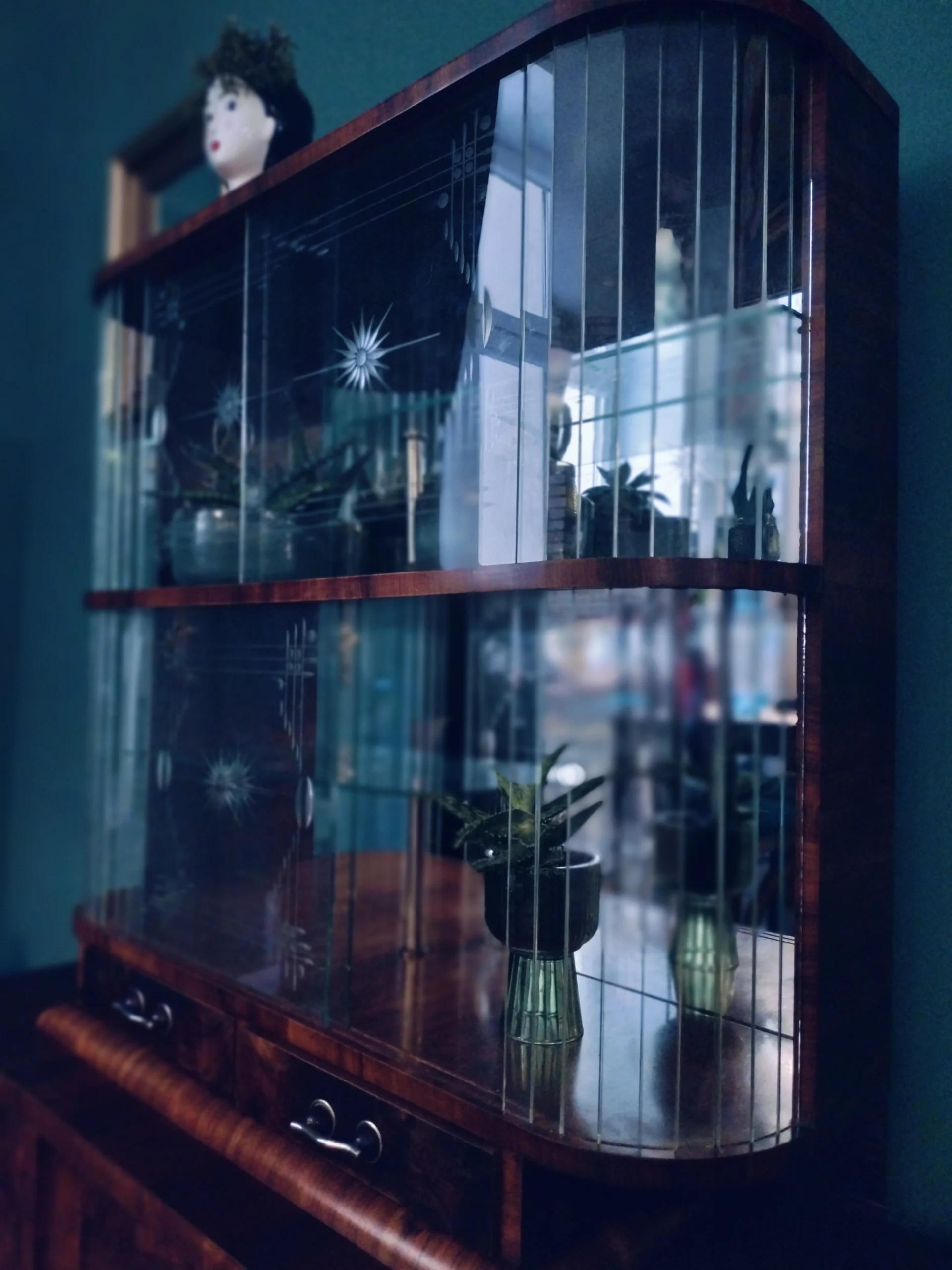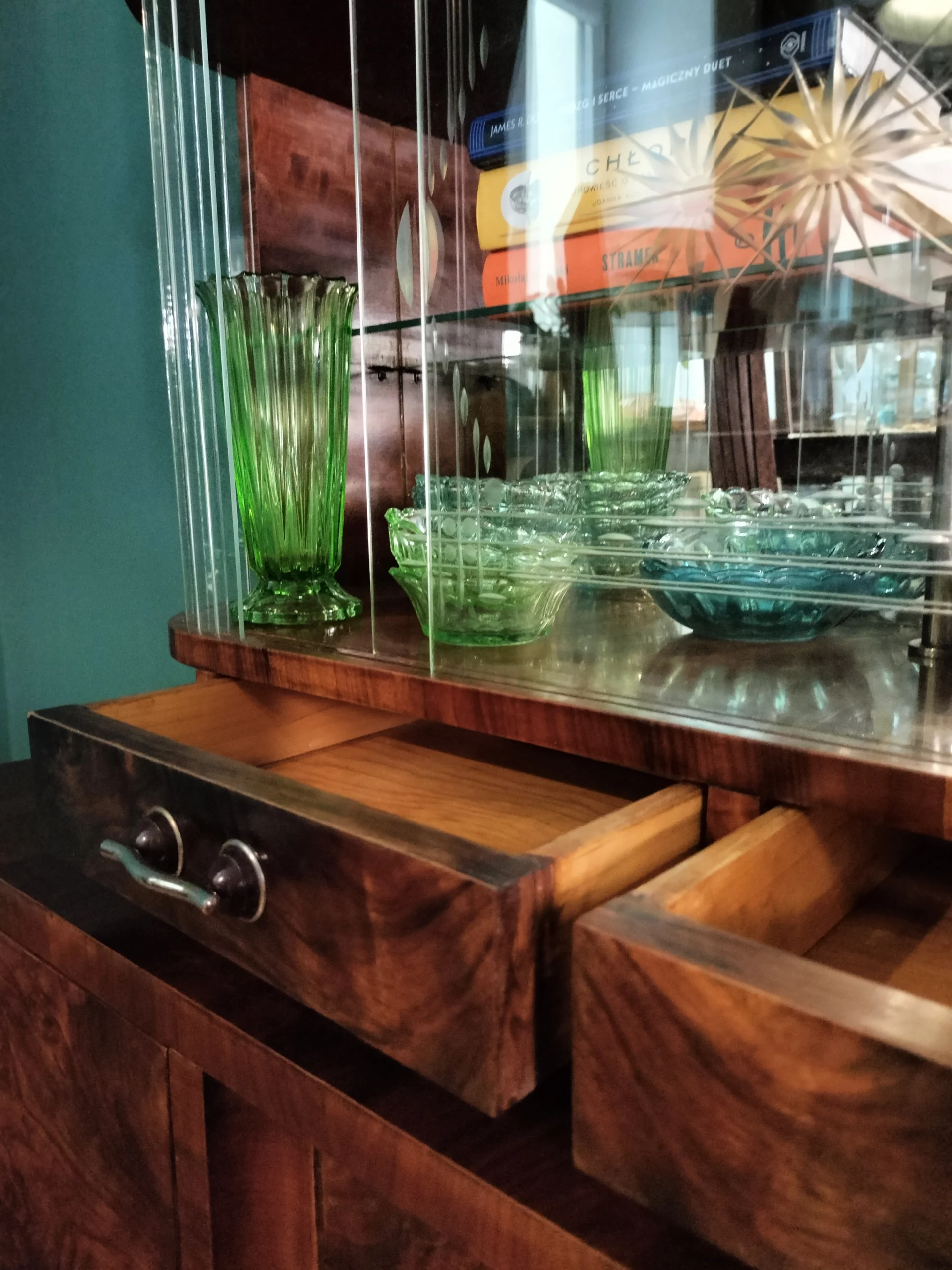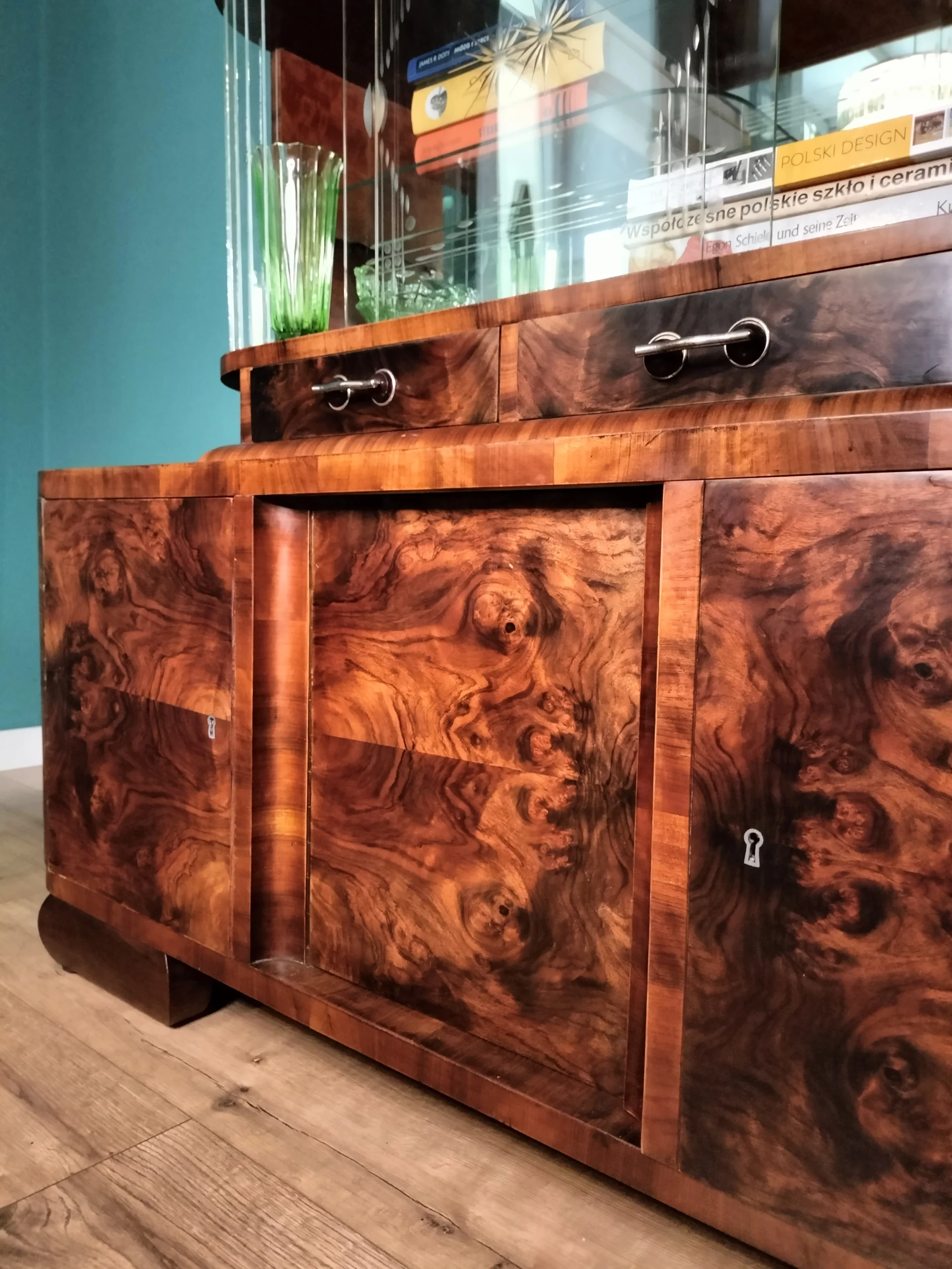 Połączenie przeszklonej górnej części z lustrem, nadaje bryle mebla lekkości. Lustra i szkło powiększą optycznie przestrzeń w której się znajdzie. Emanuje klasą, jest unikatowy, a w jego towarzystwie poczują się komfortowo zarówno ci którzy preferują minimalizm, jak ci którzy uwielbiają bogactwo dekoracyjnych dodatków. Doda blasku (dosłownie:) pomieszczeniom w Twoim domu, jaki i w firmie. To, gdzie zostanie umieszczony i jak wykorzystany, ogranicza jedynie wyobraźnia jego właściciela.Fornir w oryginalnym kolorze wpadającego w czerwień orzecha. Posiada dwie przeszklone półki, z półokrągłym zestawem paneli szklanych po 9 sztuk z każdej strony (każdy osobno umieszczony), oryginalne ozdobne szyby ze szlifowanego szkła na 2 poziomach, 2 małe szuflady oraz 2 pojemne szafki dolne (pojedyncza i podwójna). Uchwyty szuflad oryginalne.Witryna z łatwością dopasuje się do przestrzeni nowoczesnych, eklektycznych i vintage. Świetnie wyeksponuje ceramikę artystyczną, szkło dekoracyjne lub ulubione książki. Może pełnić funkcję barku, biblioteczki albo szlachetnego akcentu we wnętrzu – zachowując równowagę między estetyką a funkcją.