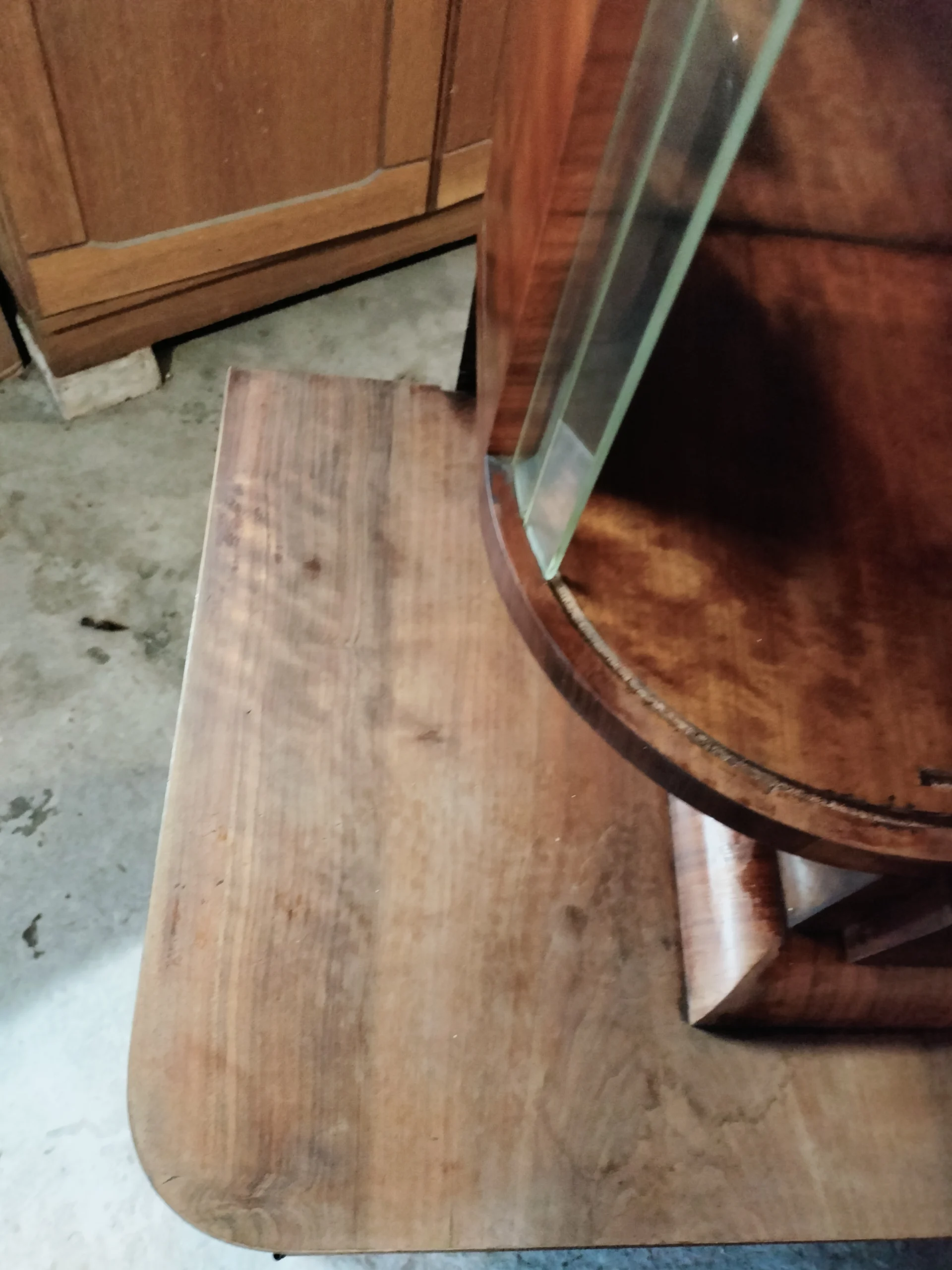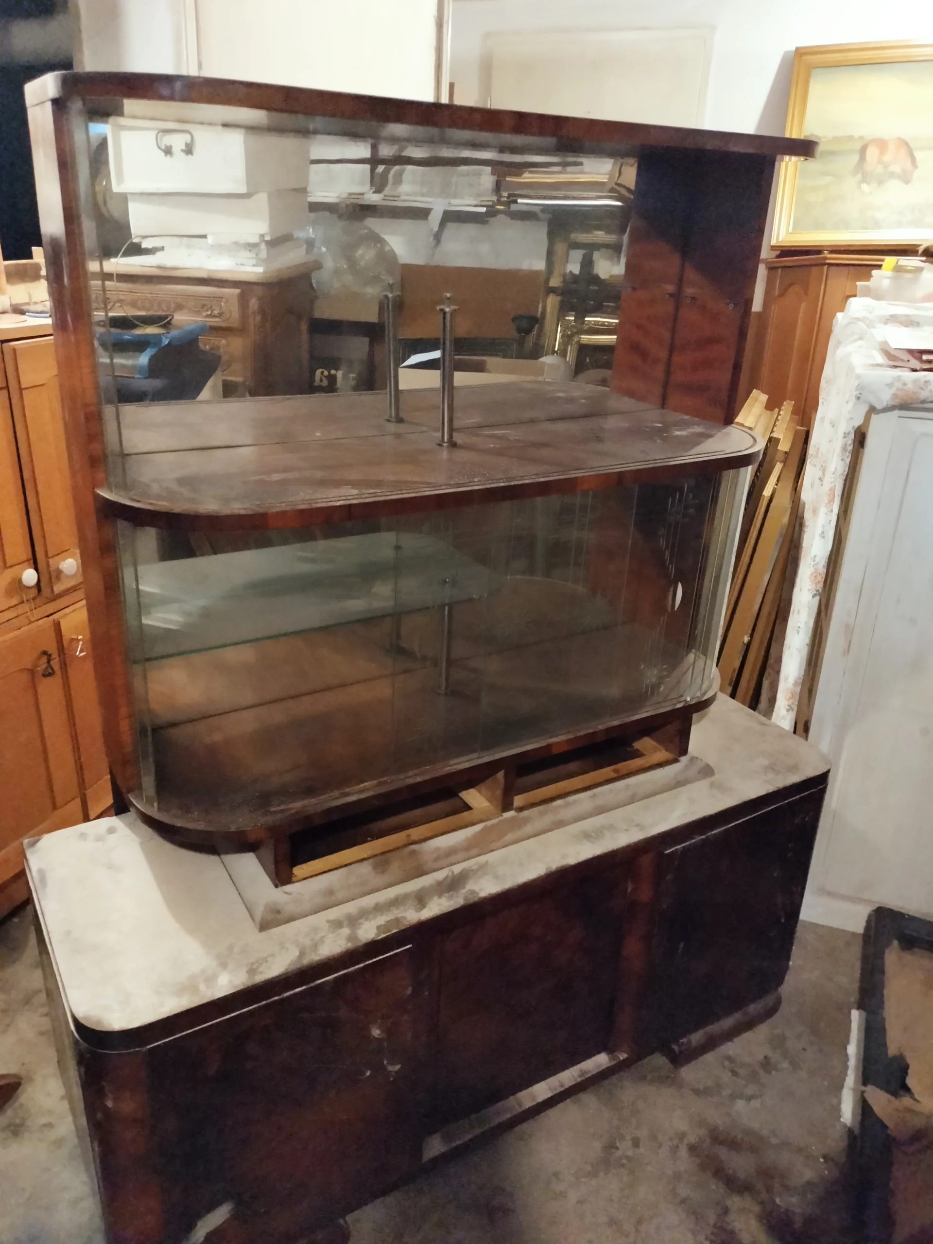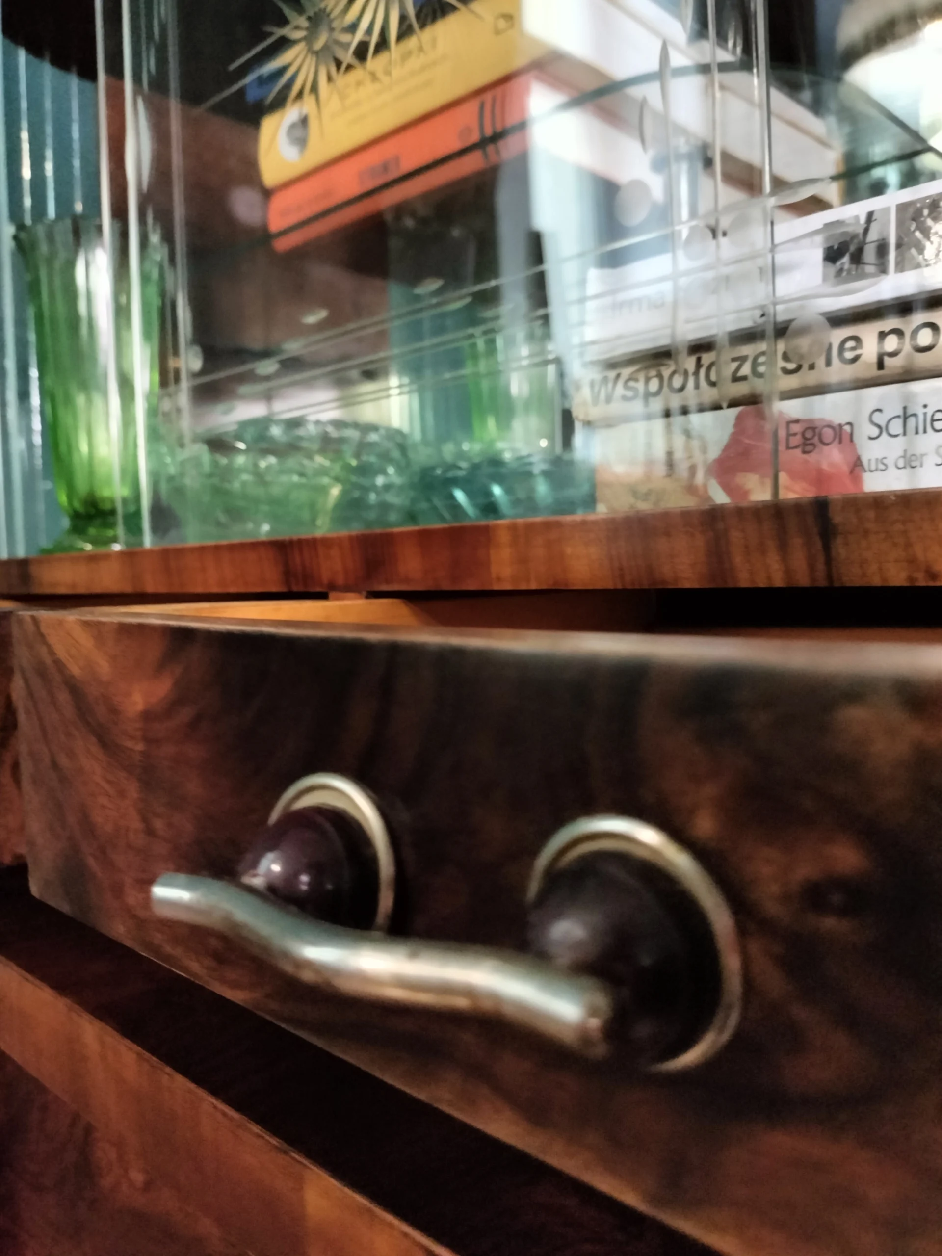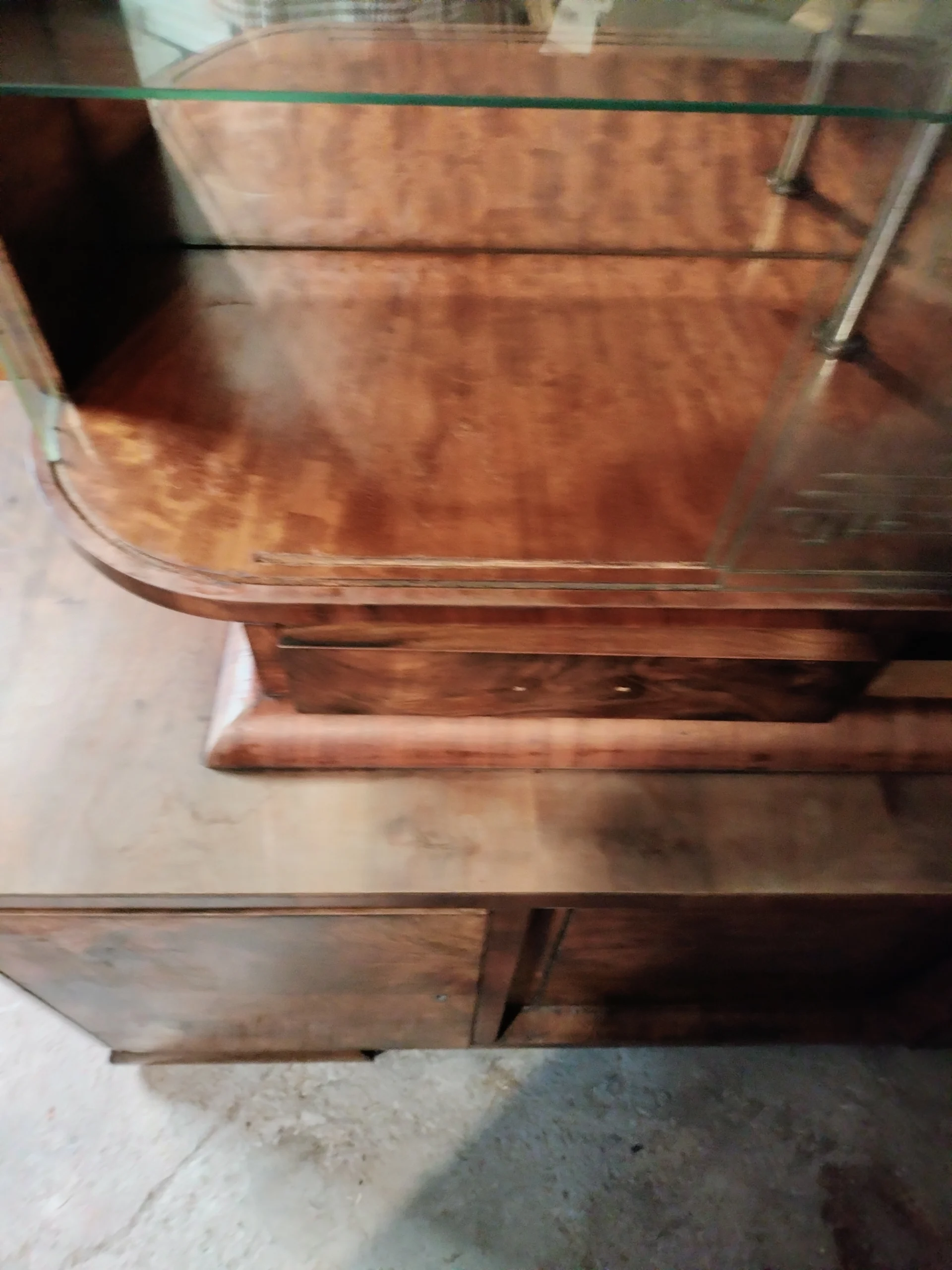 Połączenie przeszklonej górnej części z lustrem, nadaje bryle mebla lekkości. Lustra i szkło powiększą optycznie przestrzeń w której się znajdzie. Emanuje klasą, jest unikatowy, a w jego towarzystwie poczują się komfortowo zarówno ci którzy preferują minimalizm, jak ci którzy uwielbiają bogactwo dekoracyjnych dodatków. Doda blasku (dosłownie:) pomieszczeniom w Twoim domu, jaki i w firmie. To, gdzie zostanie umieszczony i jak wykorzystany, ogranicza jedynie wyobraźnia jego właściciela.Fornir w oryginalnym kolorze wpadającego w czerwień orzecha. Posiada dwie przeszklone półki, z półokrągłym zestawem paneli szklanych po 9 sztuk z każdej strony (każdy osobno umieszczony), oryginalne ozdobne szyby ze szlifowanego szkła na 2 poziomach, 2 małe szuflady oraz 2 pojemne szafki dolne (pojedyncza i podwójna). Uchwyty szuflad oryginalne.Witryna z łatwością dopasuje się do przestrzeni nowoczesnych, eklektycznych i vintage. Świetnie wyeksponuje ceramikę artystyczną, szkło dekoracyjne lub ulubione książki. Może pełnić funkcję barku, biblioteczki albo szlachetnego akcentu we wnętrzu – zachowując równowagę między estetyką a funkcją.