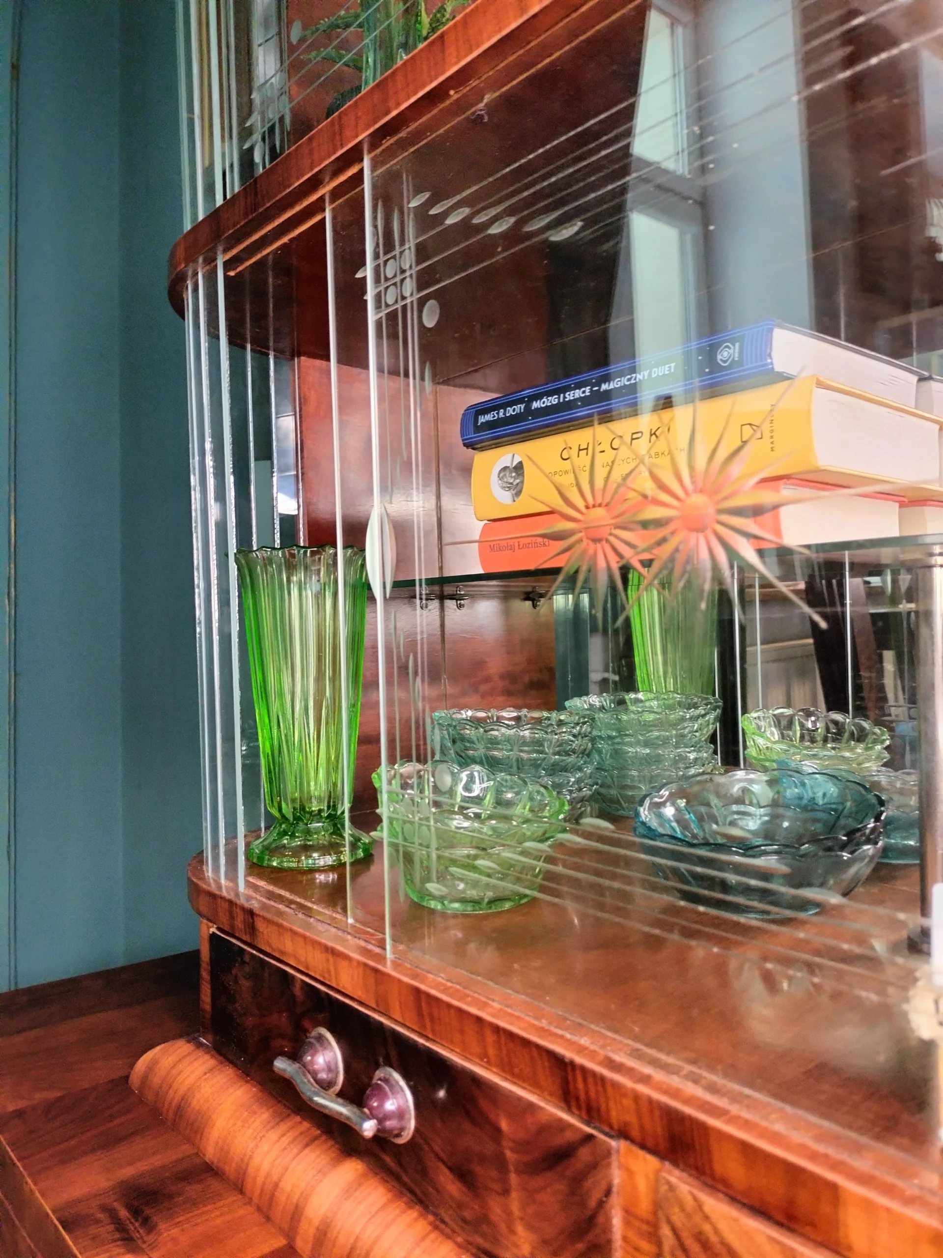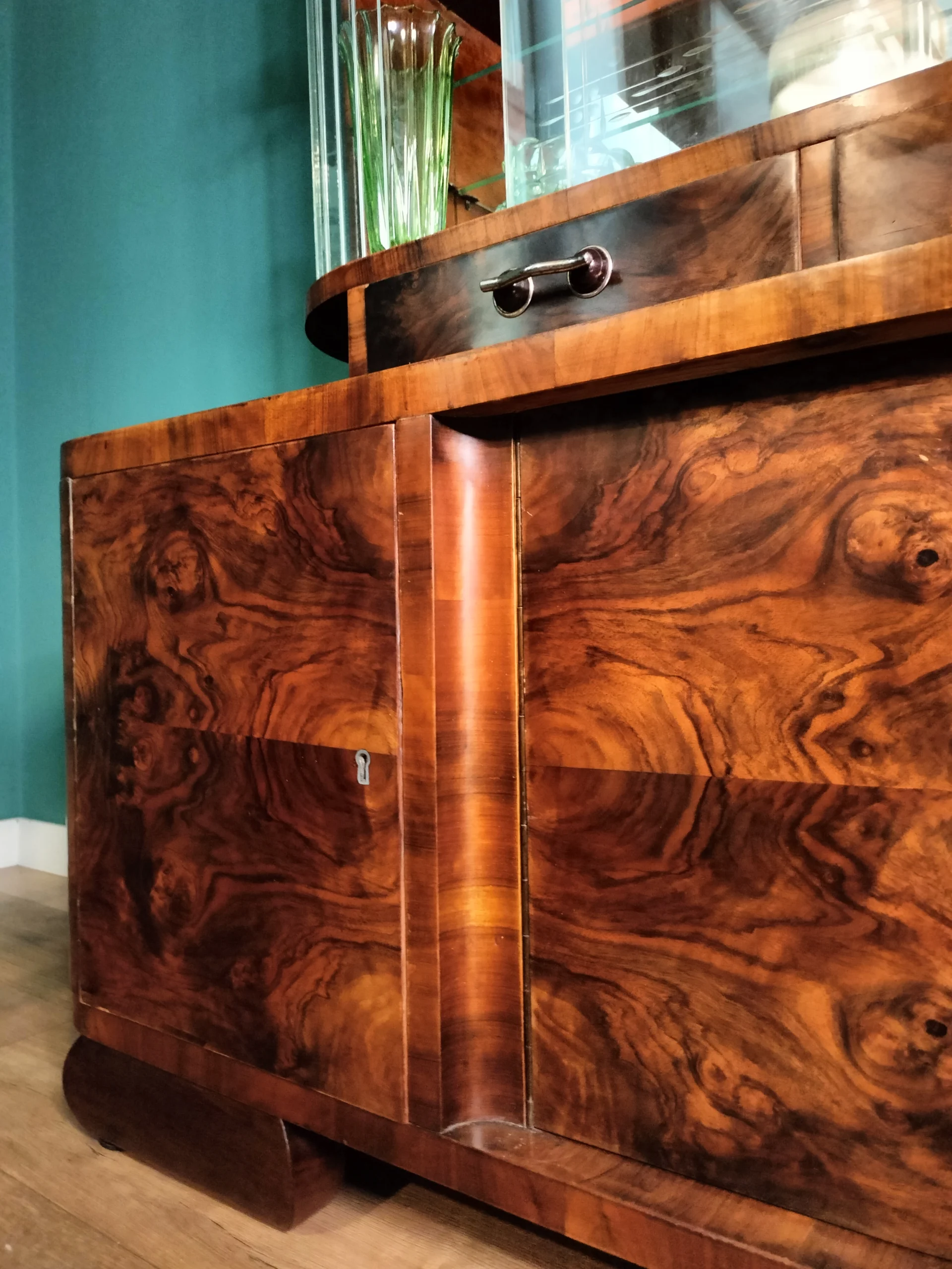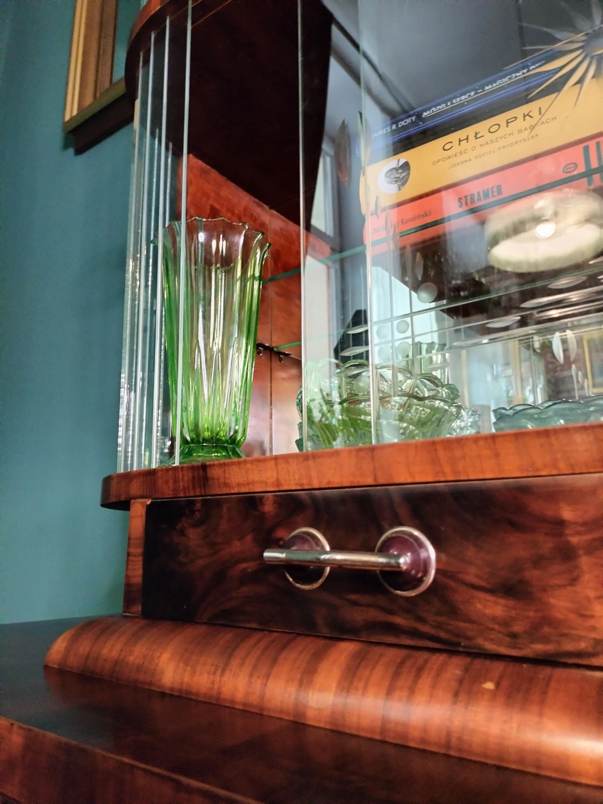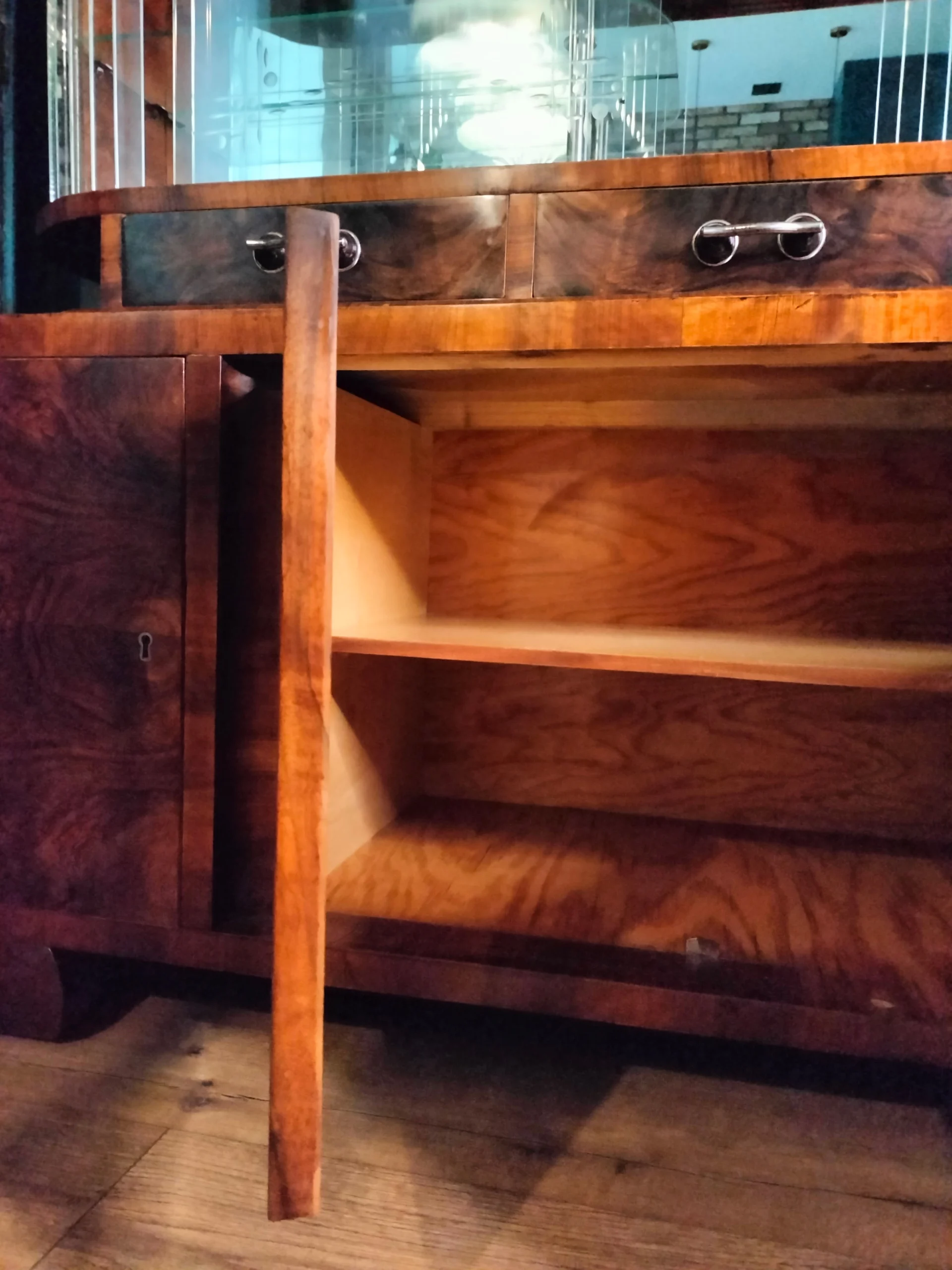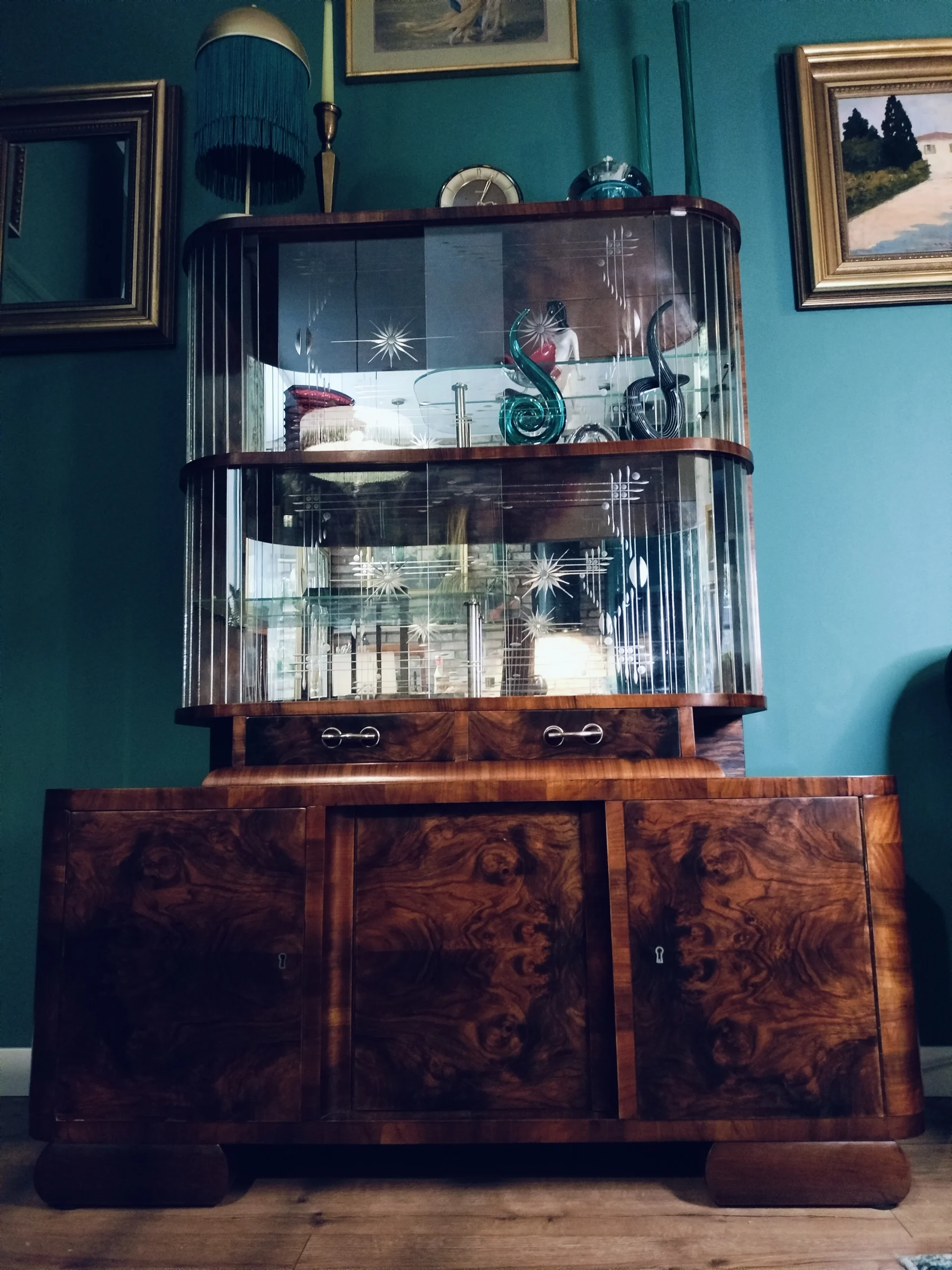 Ważne – kredens nie jest po stylizacji ale po renowacji. Należy pamiętać, że nadal jest to mebel stary, dlatego trzeba być przygotowanym, że nie jest idealny, mogą być bardzo delikatne oznaki prawie 80 -ciu lat użytkowania, jak np. na szybach lekkie ryski czy minimalne odpryski. Nie są one widoczne na tzw. pierwszy rzut oka. Zdjęcia bez filtrów i obróbek.Stylowa witryna z epoki PRL, zinterpretowana na nowo z miłością do geometrii Art Deco i kunsztu stolarskiego XX wieku. Jej charakterystyczna forma i misternie gięte szkło z matowym dekorem przywodzą na myśl wnętrza z dawnych lat – gdzie klasa spotykała się z funkcjonalnością. Dziś – po pieczołowitej renowacji – zachwyca nowym blaskiem, pozostając hołdem dla rzemiosła sprzed dekad.