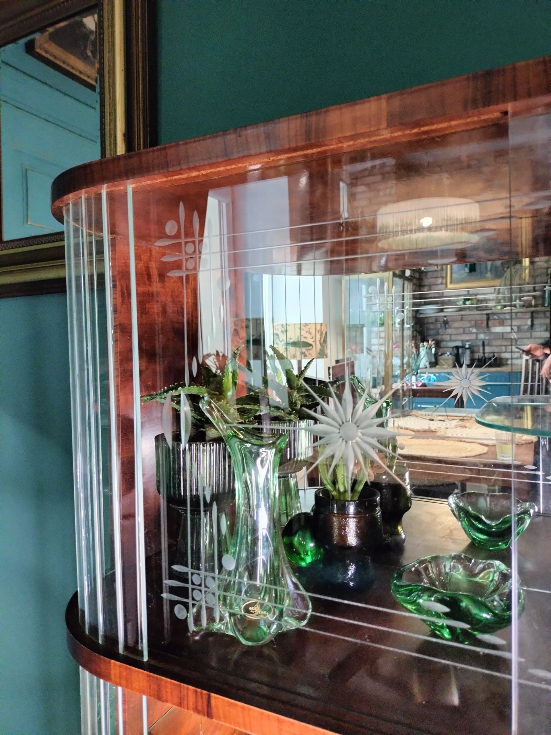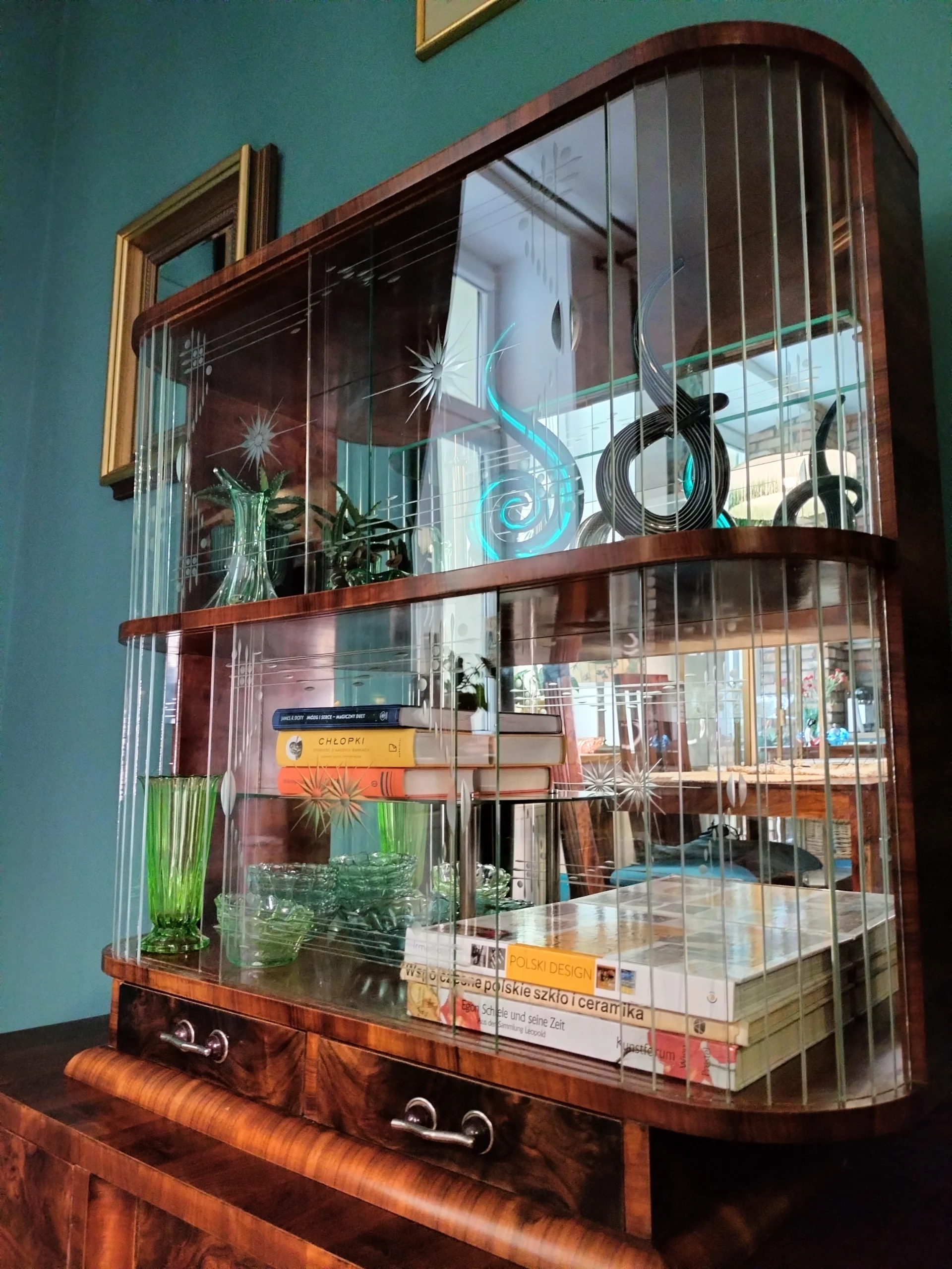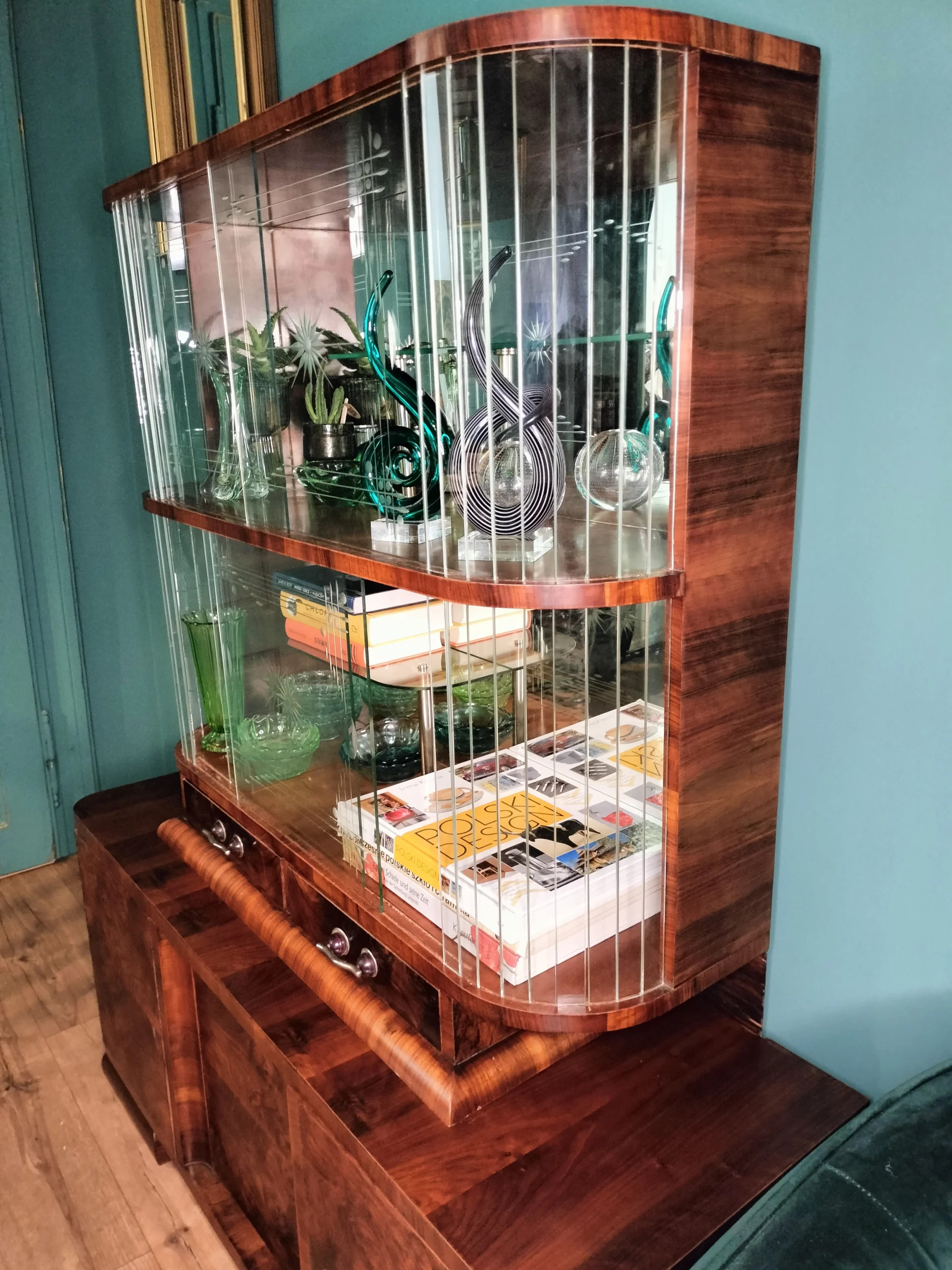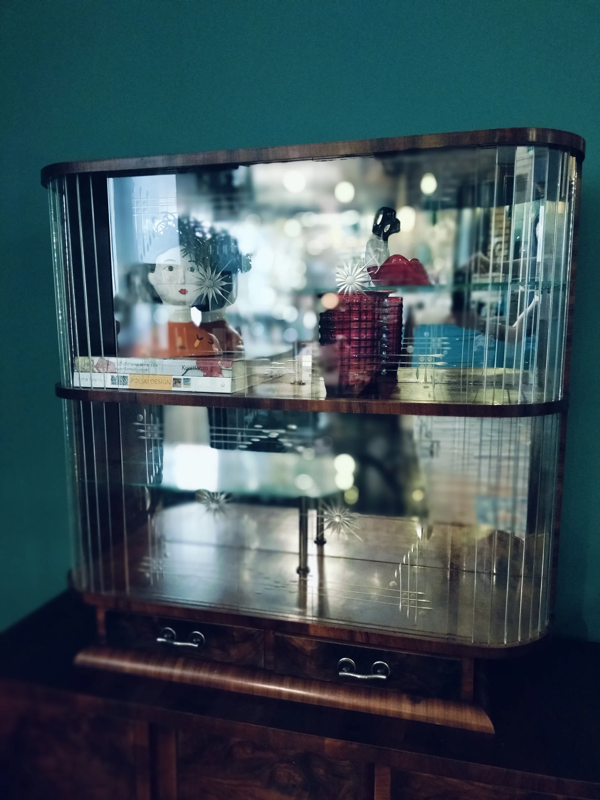 Stylowa witryna z epoki PRL, zinterpretowana na nowo z miłością do geometrii Art Deco i kunsztu stolarskiego XX wieku. Jej charakterystyczna forma i misternie gięte szkło z matowym dekorem przywodzą na myśl wnętrza z dawnych lat – gdzie klasa spotykała się z funkcjonalnością. Dziś – po pieczołowitej renowacji – zachwyca nowym blaskiem, pozostając hołdem dla rzemiosła sprzed dekad.