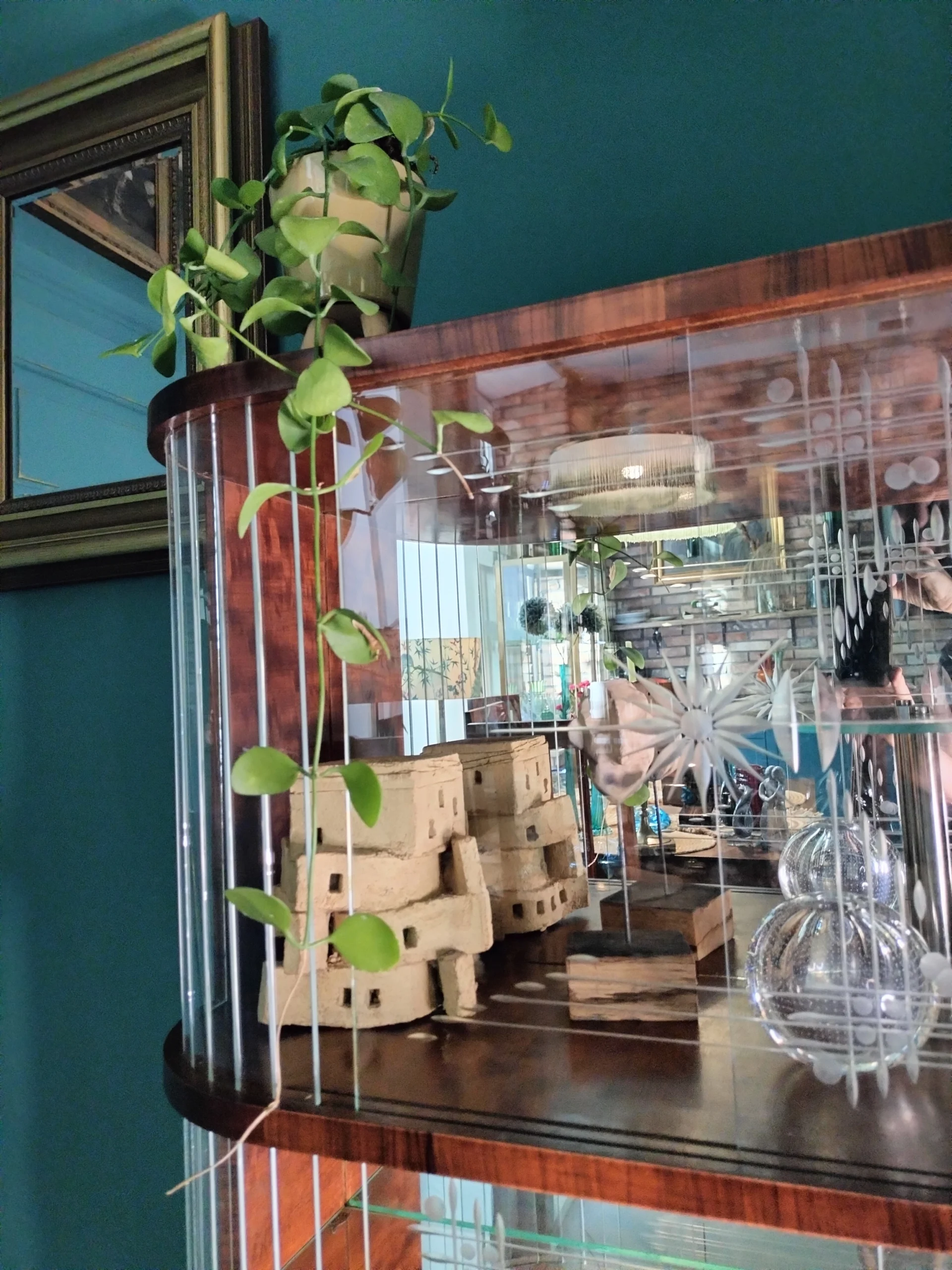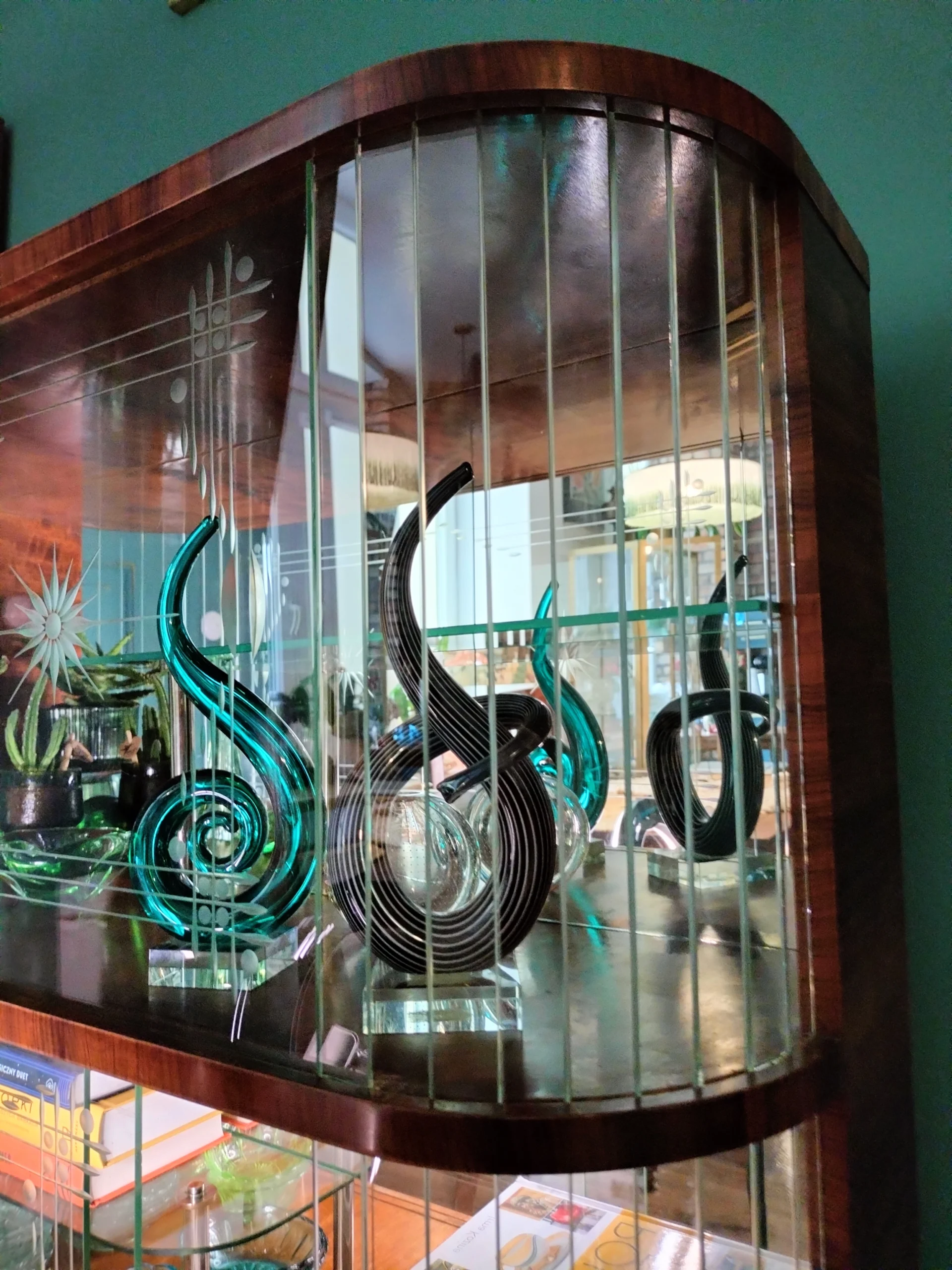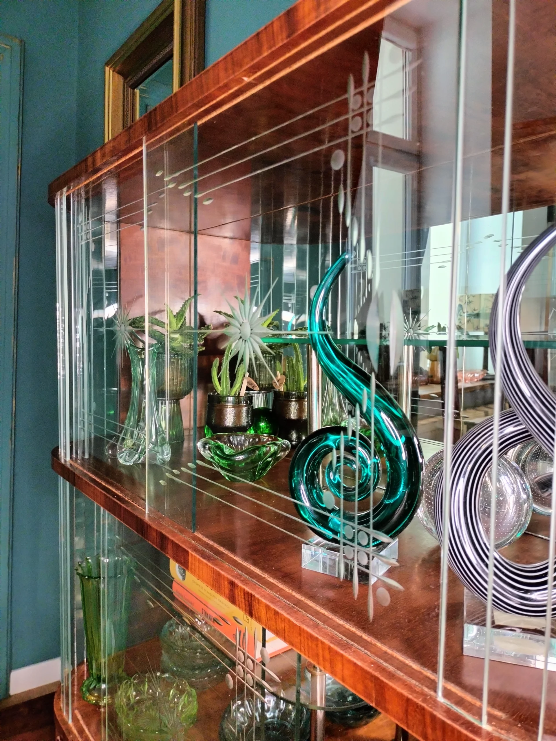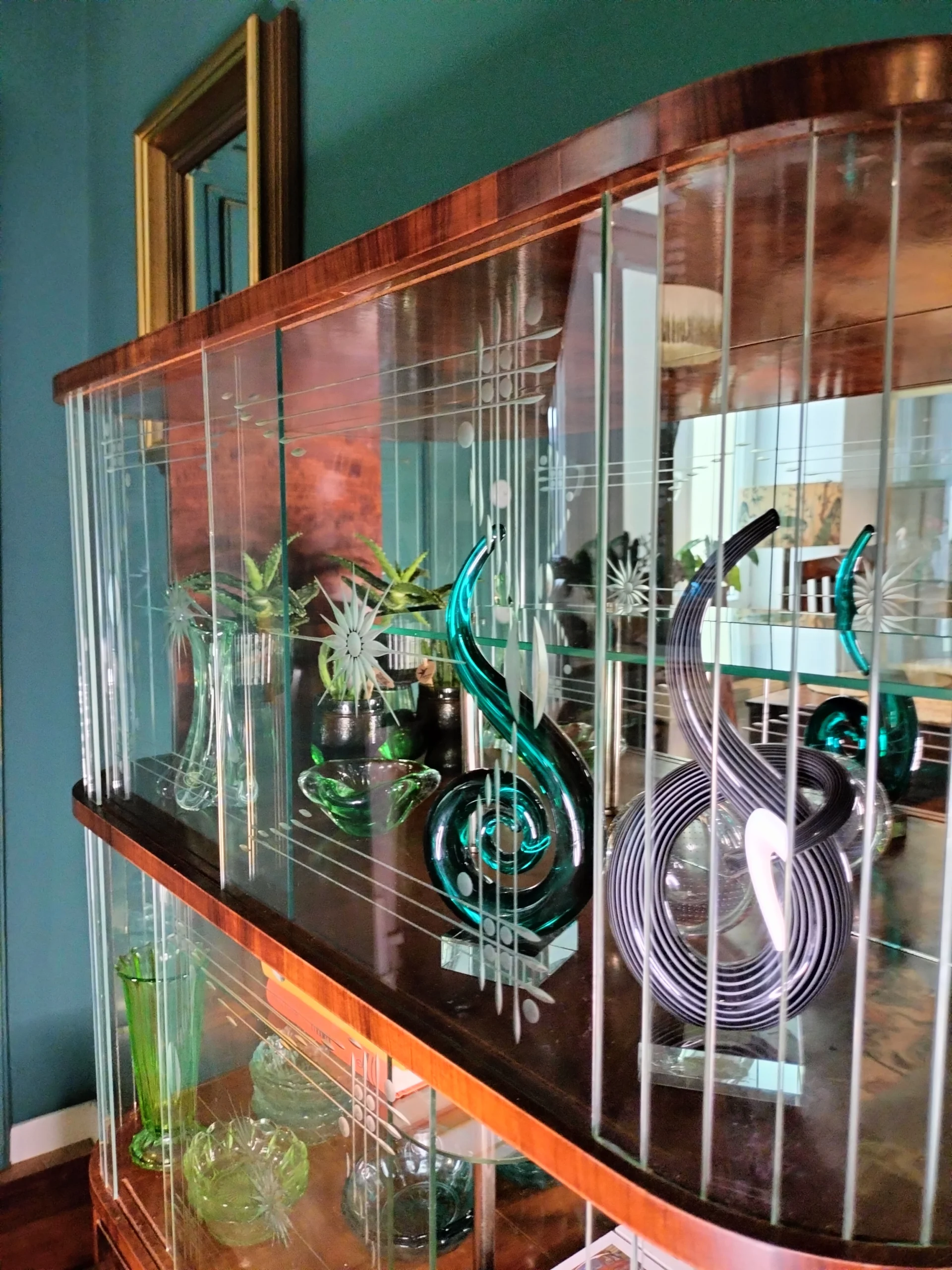 Stylowa witryna z epoki PRL, zinterpretowana na nowo z miłością do geometrii Art Deco i kunsztu stolarskiego XX wieku. Jej charakterystyczna forma i misternie gięte szkło z matowym dekorem przywodzą na myśl wnętrza z dawnych lat – gdzie klasa spotykała się z funkcjonalnością. Dziś – po pieczołowitej renowacji – zachwyca nowym blaskiem, pozostając hołdem dla rzemiosła sprzed dekad.