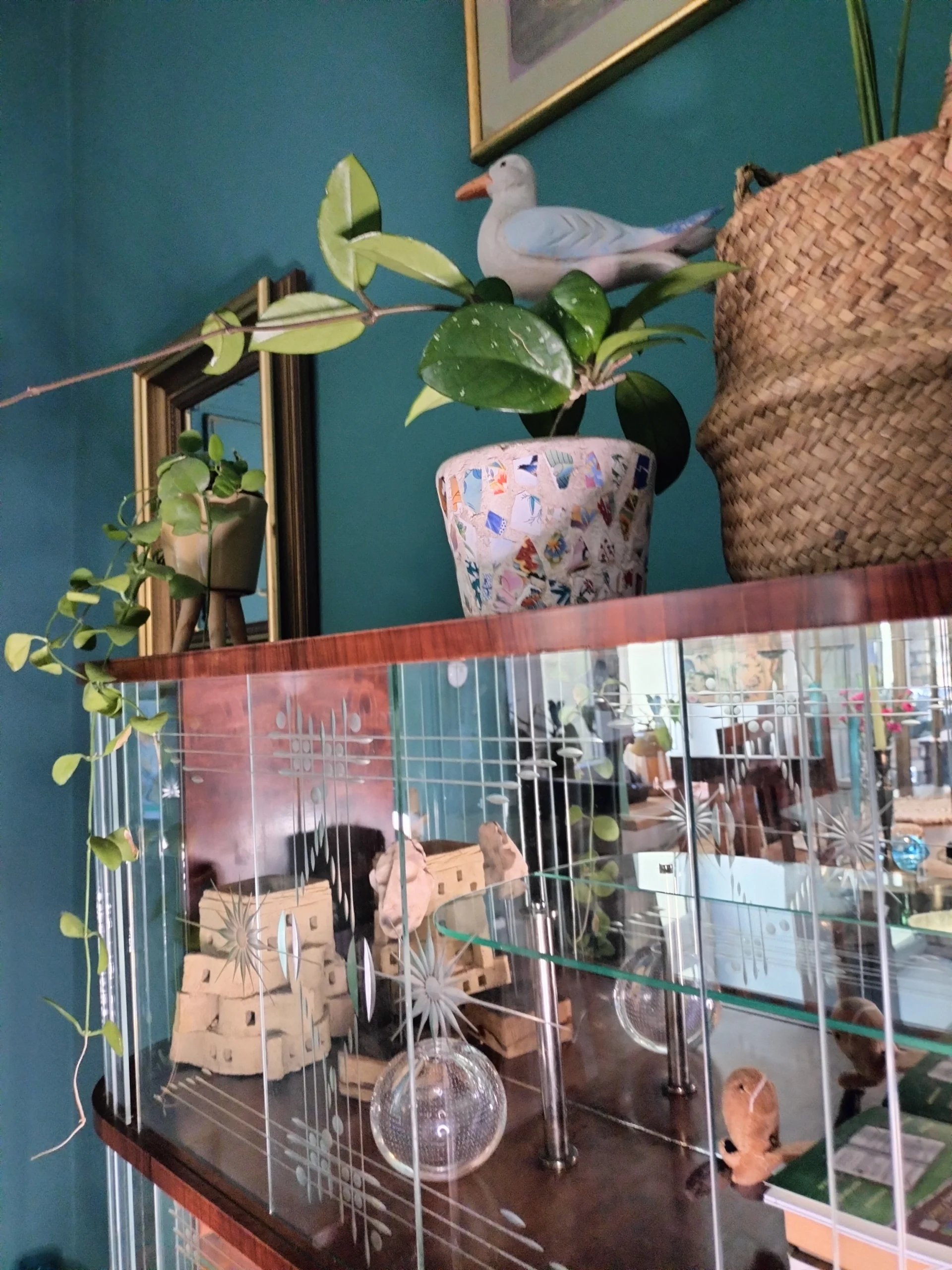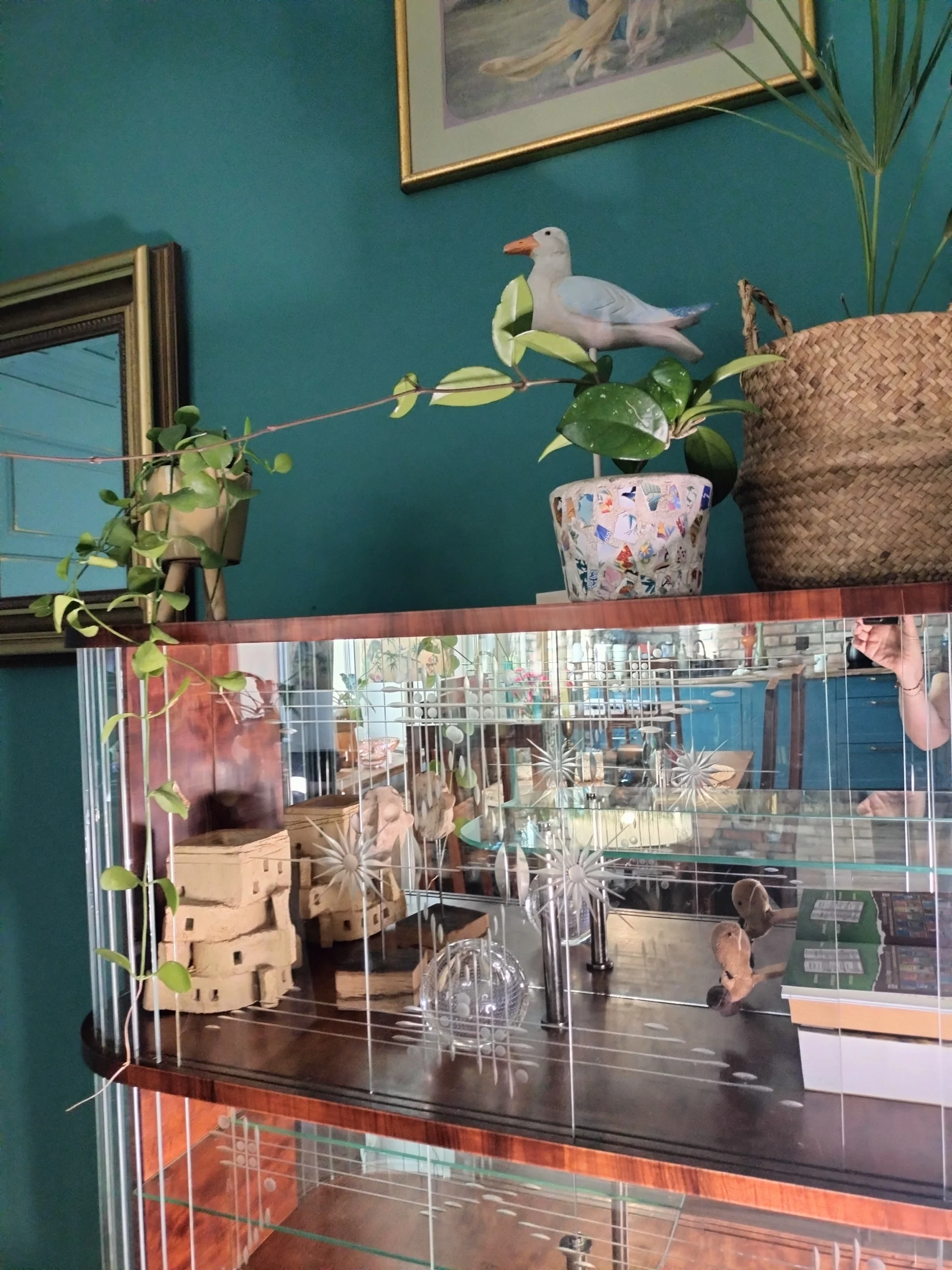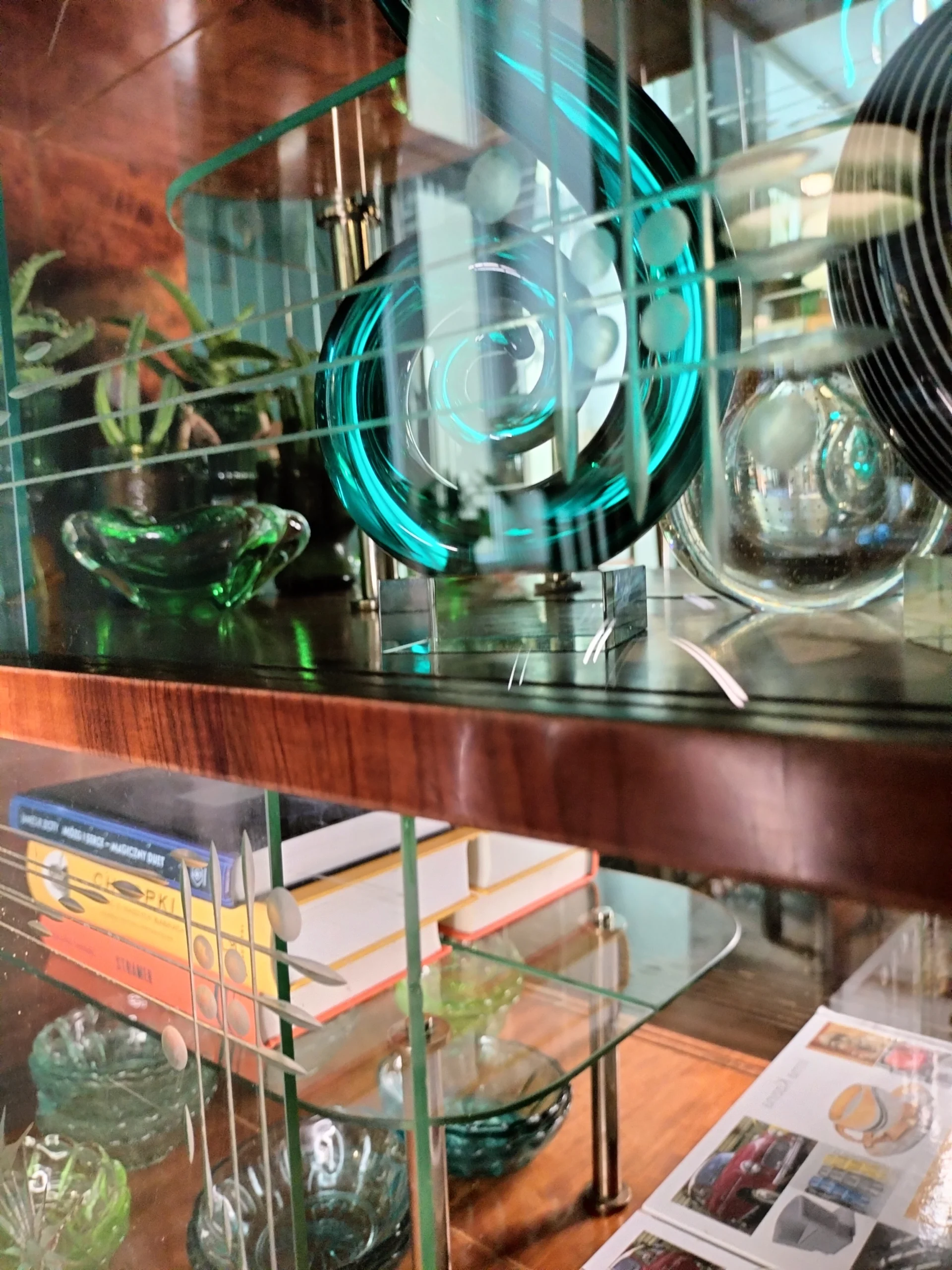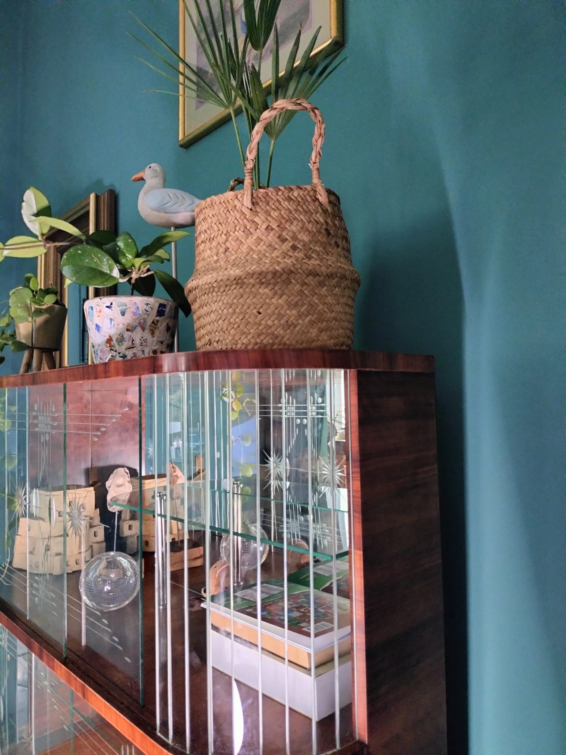 Stylowa witryna z epoki PRL, zinterpretowana na nowo z miłością do geometrii Art Deco i kunsztu stolarskiego XX wieku. Jej charakterystyczna forma i misternie gięte szkło z matowym dekorem przywodzą na myśl wnętrza z dawnych lat – gdzie klasa spotykała się z funkcjonalnością. Dziś – po pieczołowitej renowacji – zachwyca nowym blaskiem, pozostając hołdem dla rzemiosła sprzed dekad.