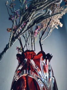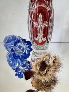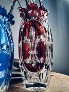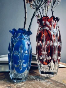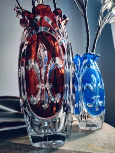 Zestaw „Kryształowe irysy” to duet szlachetnych wazonów z grubego, barwionego szkła kryształowego, który olśniewa detalem i klasyczną elegancją. Wykonane z mistrzowską precyzją, zdobione dekoracyjnym motywem fleur-de-lis czyli stylizowana lilia lub irys, które są częstym motywem powtarzanym w sztuce i widnieją nawet na przedmiotach pozostałych po starożytnych cywilizacjach. Po francusku fleur-de-lis oznacza „kwiat lilii”. Fleur oznacza „kwiat”, a lis — „lilię”. Łączą monumentalną formę z subtelnym połyskiem światła odbijanego przez głęboko szlifowaną powierzchnię.