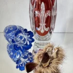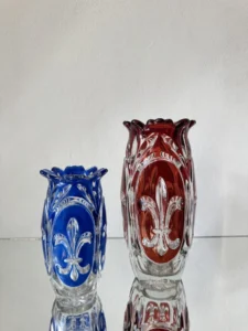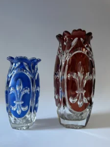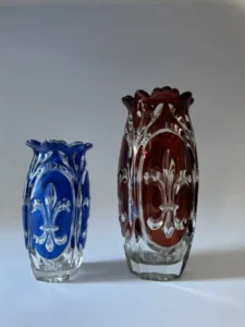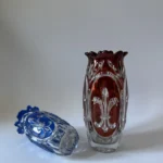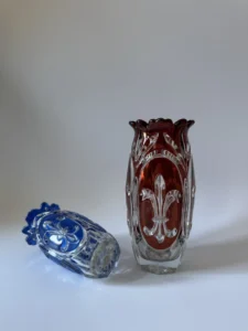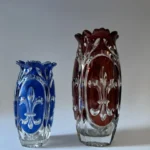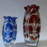 Pochodzenie: zestaw czeskiego szkła Bohemia z lat 50-tych ubiegłego wieku, tworzą dwa kolorowe kryształowe wazony rubinowy i niebieski.
