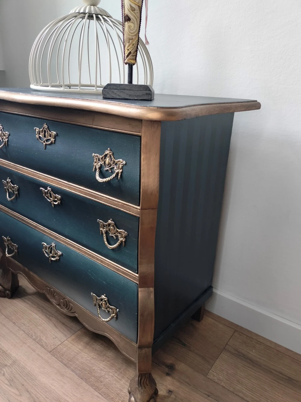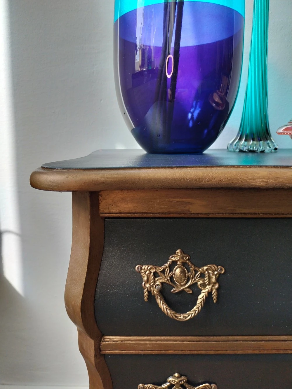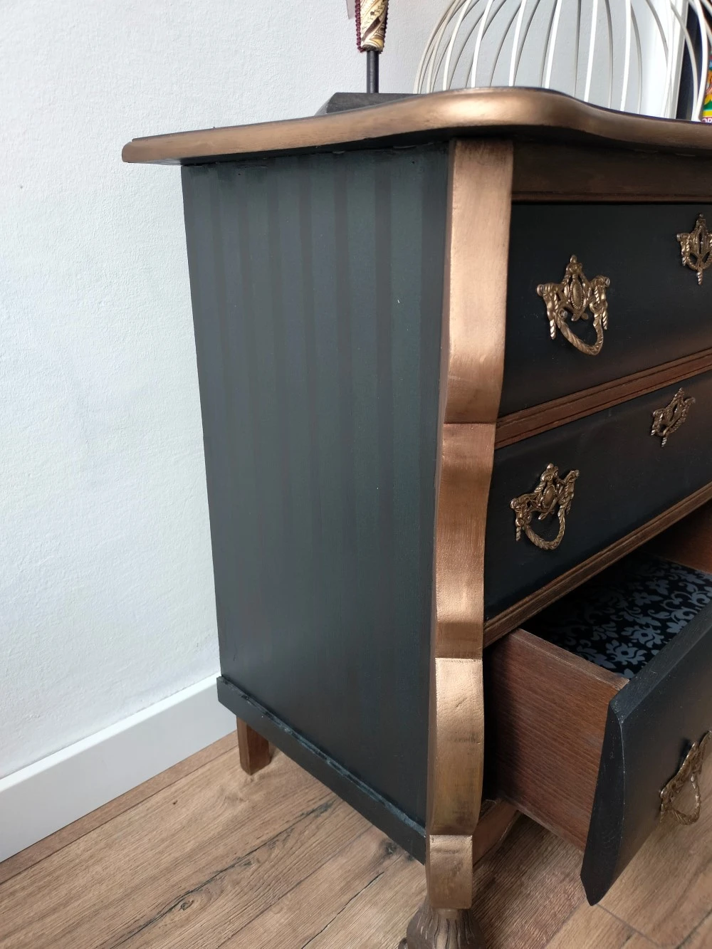 Mała czarna komoda „mała czarna” – mała komoda z serii moich zachwytów nad połączeniem profilowanych kształtów mebla z opalizującą czernią blatu. Prosta stylizacja, czerń z drobinkami zieleni oraz patynowane pozostałe drewniane części mebla. Boki ozdobione opalizującymi pasami, które dodają elegancji. Blat zabezpieczony farbą do blatów, tak aby nie robiły się plamy. Z racji wymiarów mebel może ozdobić mniejsze wnętrza mieszkania czy firmy. Komoda ciężka jak na swój rozmiar, w dużej części dębowa.REZERWACJA