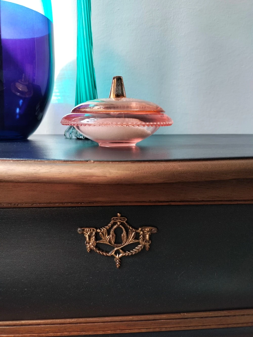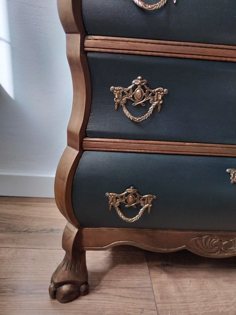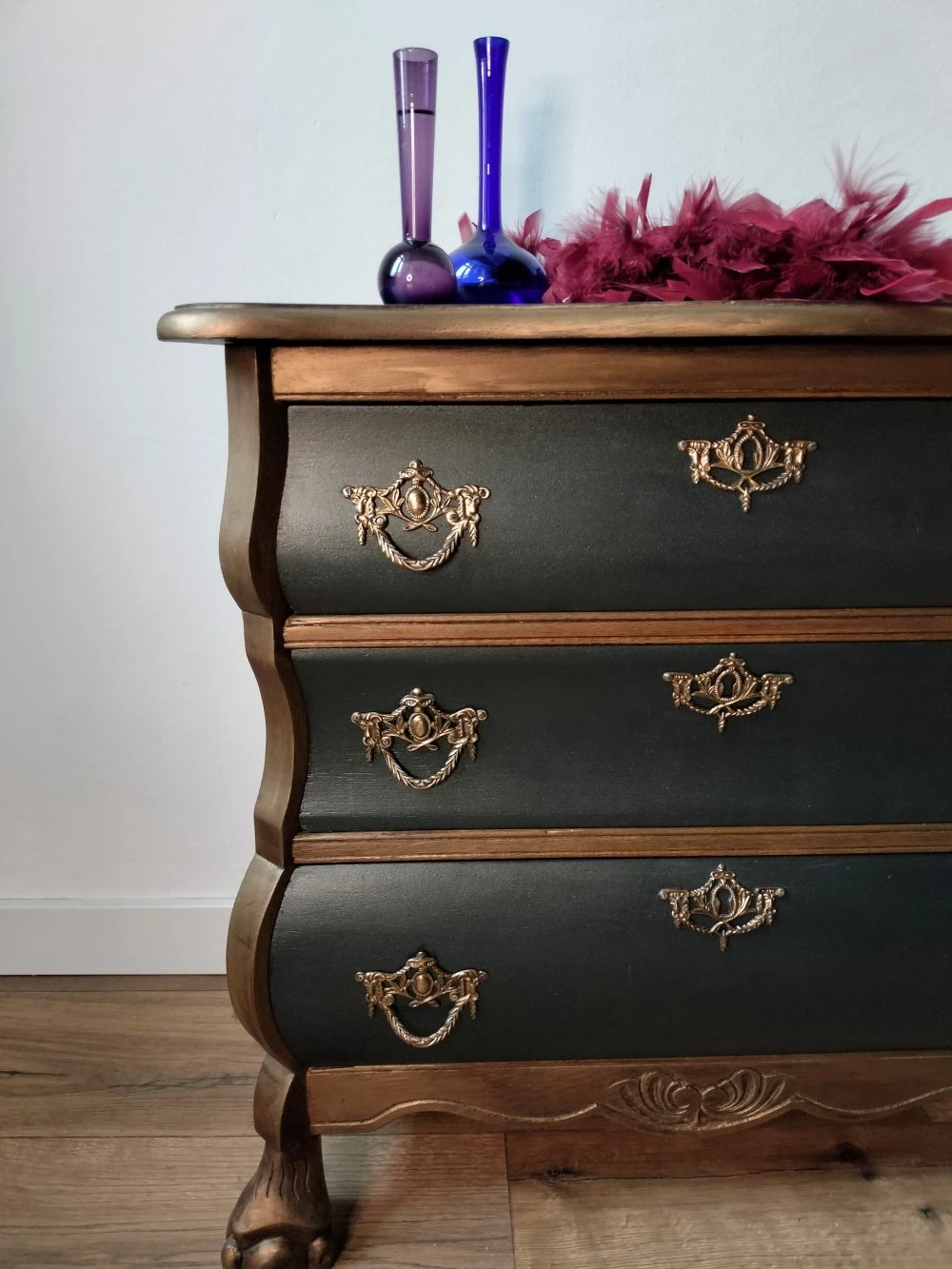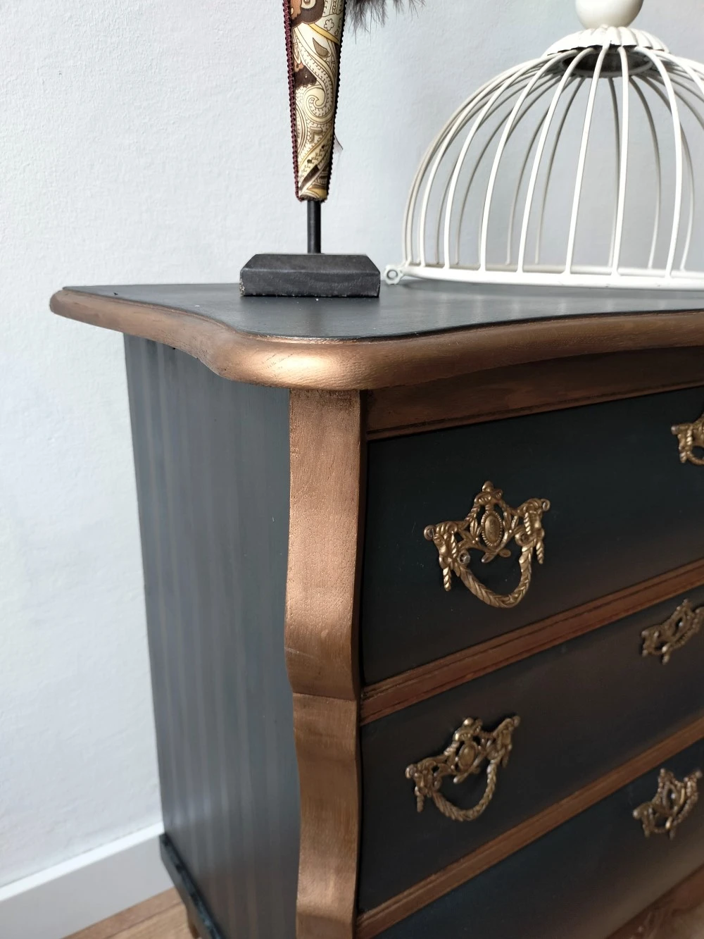 Mała czarna komoda „mała czarna” – mała komoda z serii moich zachwytów nad połączeniem profilowanych kształtów mebla z opalizującą czernią blatu. Prosta stylizacja, czerń z drobinkami zieleni oraz patynowane pozostałe drewniane części mebla. Boki ozdobione opalizującymi pasami, które dodają elegancji. Blat zabezpieczony farbą do blatów, tak aby nie robiły się plamy. Z racji wymiarów mebel może ozdobić mniejsze wnętrza mieszkania czy firmy. Komoda ciężka jak na swój rozmiar, w dużej części dębowa.REZERWACJA