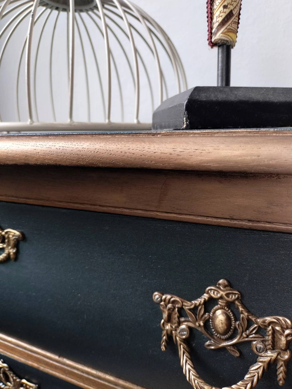 Wymiary:szerokość 66 cm głębokość 35,5 cm wysokość 64 cm wymiary szuflad szerokość 43 cm głębokość 21 cm wysokość 10 cmFarba Libéron Barwy Czerni – Czarna Zieleń Libéron patyna Antyczny brąz