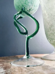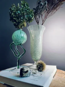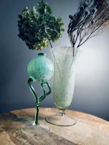 Pucharowy wazon vintage z dmuchanego szkła barwionego w masie na subtelny miętowy marmurek. Kształt kielicha i stabilna stopa nadają mu klasyczny, a zarazem nowoczesny charakter. Doskonale prezentuje się solo lub z delikatnymi, wysuszonymi gałązkami. Duży wazon kielich z ręcznie formowanego szkła sodowego z tzw. iskierkami w odcieniach kolorze delikatnej mięty. Brzusiec wykonany w typie antico – krążek podstawy przeźroczysty. Wazon prawdopodobnie pochodzi z Czechosłowacji lun z Murano we Włoszech, lata 70-te XX w