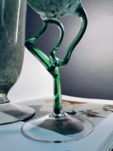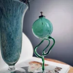 Ręcznie dmuchana lampa oliwna z zielonym szkłem o organicznym kształcie, na stabilnej, przezroczystej podstawie. Niezwykły korpus w kształcie kuli przypomina dmuchawcowy pąk, z piękną strukturą zatopionych w szkle bąbelków i mlecznych akcentów. Idealna do dekoracji stołu lub jako mini-rzeźba użytkowa. Powstała z najwyższej jakości artystycznego szkła dwuwarstwowego, barwionego masie na rzadko spotykane zielone mory, przypominające marmur. Pochodzi prawdopodobnie z Huty Szkła Ozdobnego Makora w Krośnie z lat 80/90 minionego stulecia.
