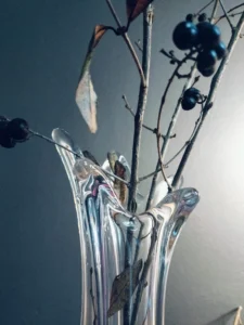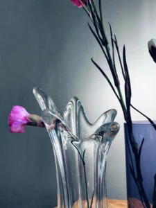 Wysoki wazon ze szkła bezbarwnego o miękko modelowanej, organicznej formie – jego górne, rozchylone krawędzie przypominają szkło poruszone wiatrem. Wspaniale prezentuje smukłe kompozycje z długich gałęzi lub pojedynczych kwiatów. Unikatowy, jednokolorowy „palczasty” wazon został prawdopodobnie wykonany w wytwórni Val St. lambert w latach 60. XX wieku, na terenie Belgii. Może to być też czeskie szkło lub szkło Murano we Włoszech.