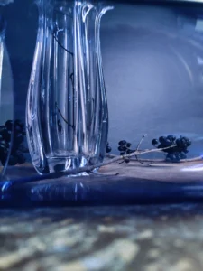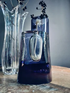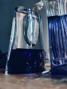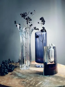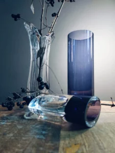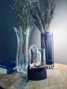 Kontrast faktur i odcieni – od przejrzystego szkła po głębokie kobalty i grafitowe refleksy.