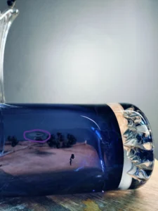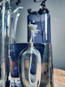lamka oliwna, ręcznie formowana, z ciemno filetowym wypełnieniem, nalaniem szkła i przeźroczystą górą – surowa, minimalistyczna estetyka z wyrazistym akcentem. Unikatowa w kolorze lampka (na oliwy zapachowe), wyróżniająca się kształtem, a przed wszystkim kolorem barwionego na fiolet szkła, którego odcień zmienia się w zależności od konta patrzenia i padającego światła. Knot sznurkowy ze szklanym mocowaniem. Oryginalna naklejka. Całość niejednoznaczna, unikatowa, dodająca klasy wnętrzu w każdym stylu.