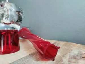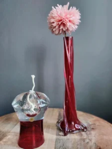 Zestaw „Płomienny duet” to odważne połączenie dwóch dzieł sztuki użytkowej z duszą vintage – smukłego, skręcanego wazonu w głębokiej czerwieni oraz oryginalnej oliwki naftowej z przezroczystą bańką wewnątrz. Oba elementy to ręcznie wykonane szkło artystyczne z lat 70. i 80., zachwycające precyzją formy i intensywnością barw.