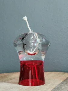 Szklana oliwka olejowa (sygnowana Krosno, z oryginalną metką „Made in Poland”) to obiekt kolekcjonerski – posiada szklaną kulę zatopioną wewnątrz bańki, co tworzy trójwymiarowy efekt unoszącego się światła. Możesz wykorzystać ją zgodnie z przeznaczeniem, jako świeczkę z knotem lub po prostu jako hipnotyzującą rzeźbę na półce.